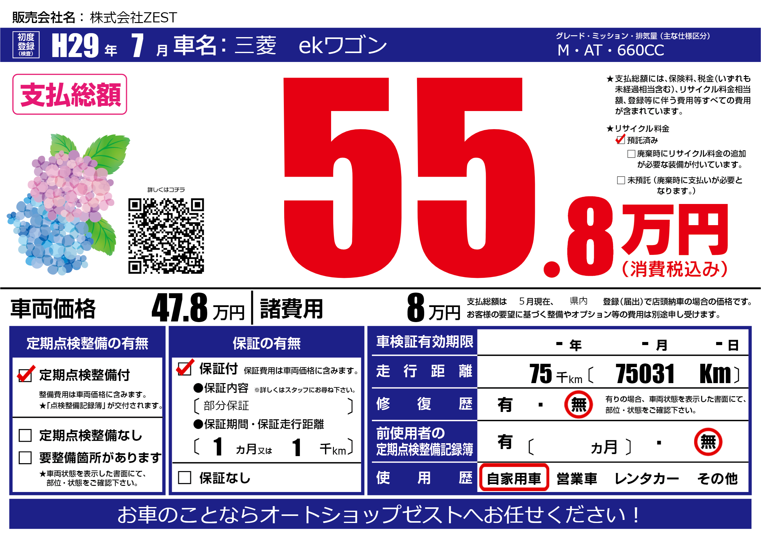 | 走行キロ | 7.5万km | 初年度登録 | H29年7月 |