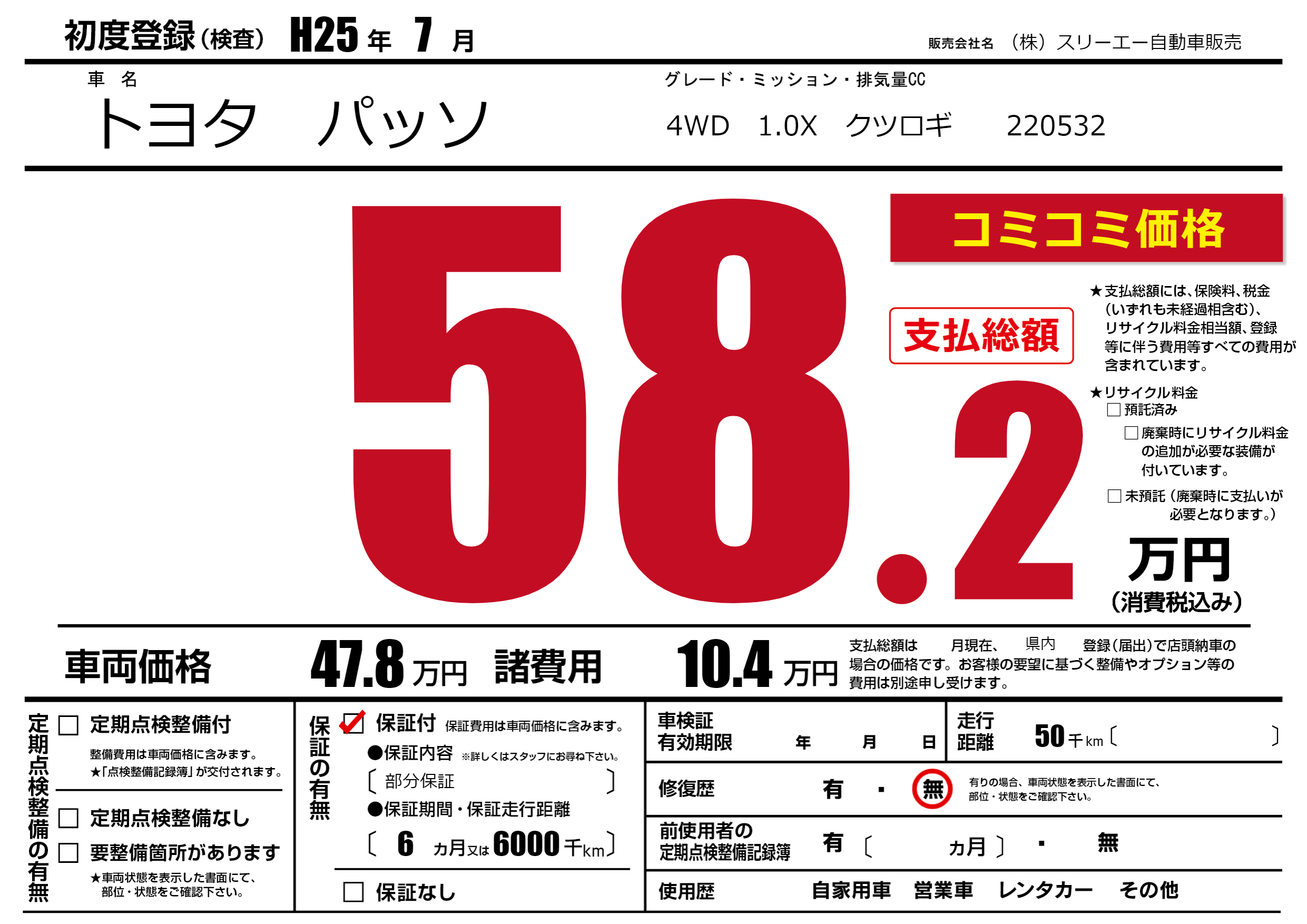 | 車名 | トヨタ パッソ | グレード ミッション 排気量 |