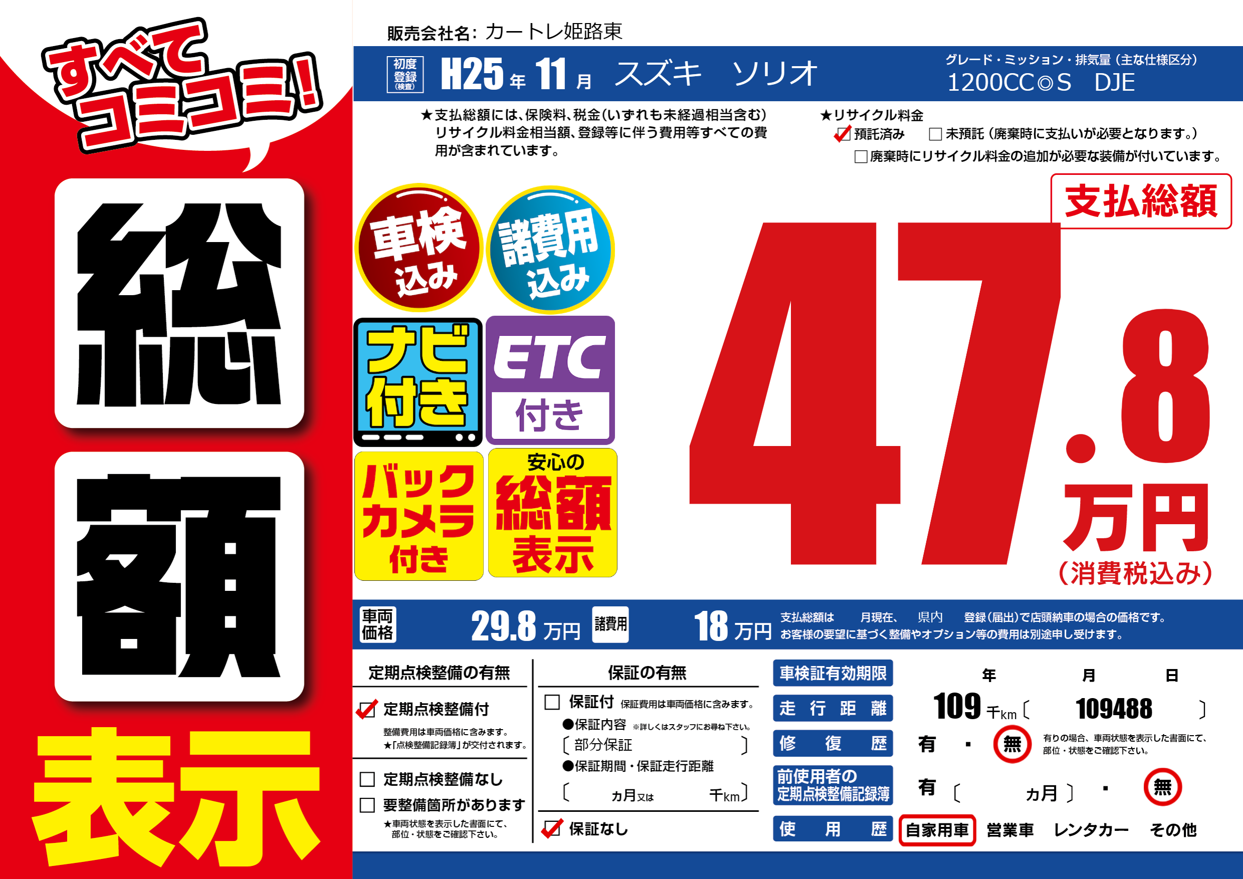 | 走行キロ | 10.9万km | 初年度登録 | H25年11月 |