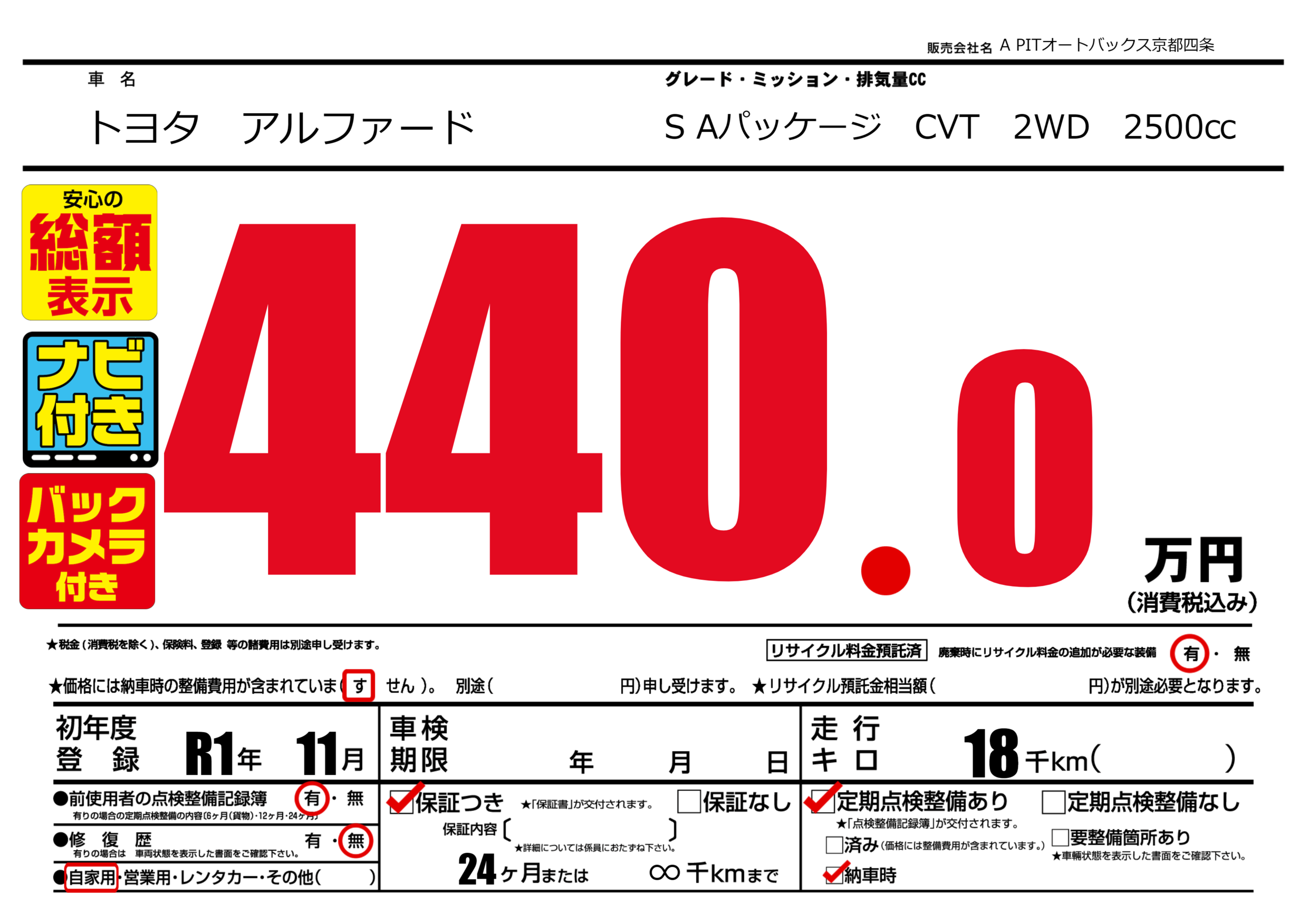 | 車名 | トヨタ アルファード | グレード ミッション 排気量 |
