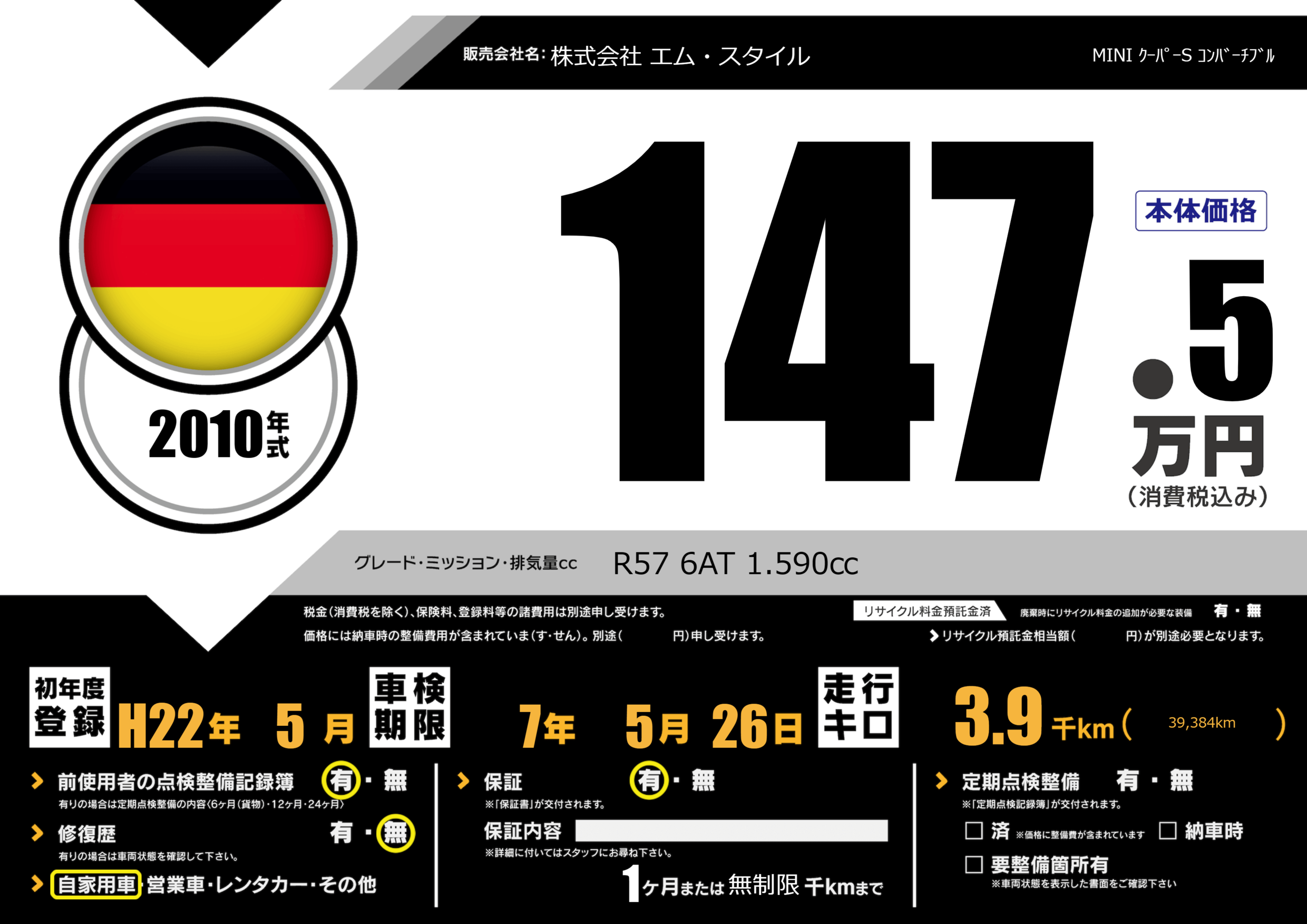 | 車名 | MINI クーパーS コンバーチブル | グレード ミッション 排気量 |