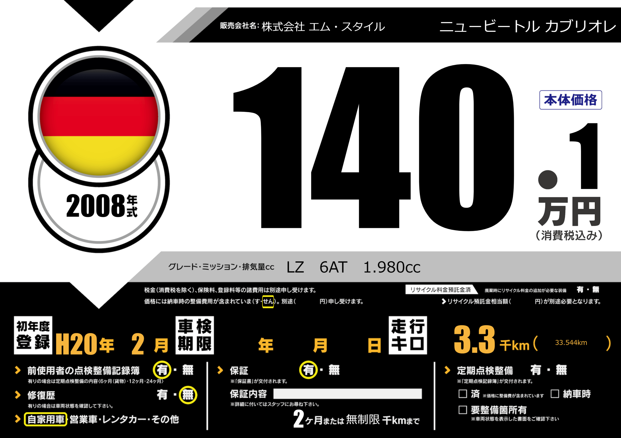 | 車名 | ニュービートル カブリオレ | グレード ミッション 排気量 |