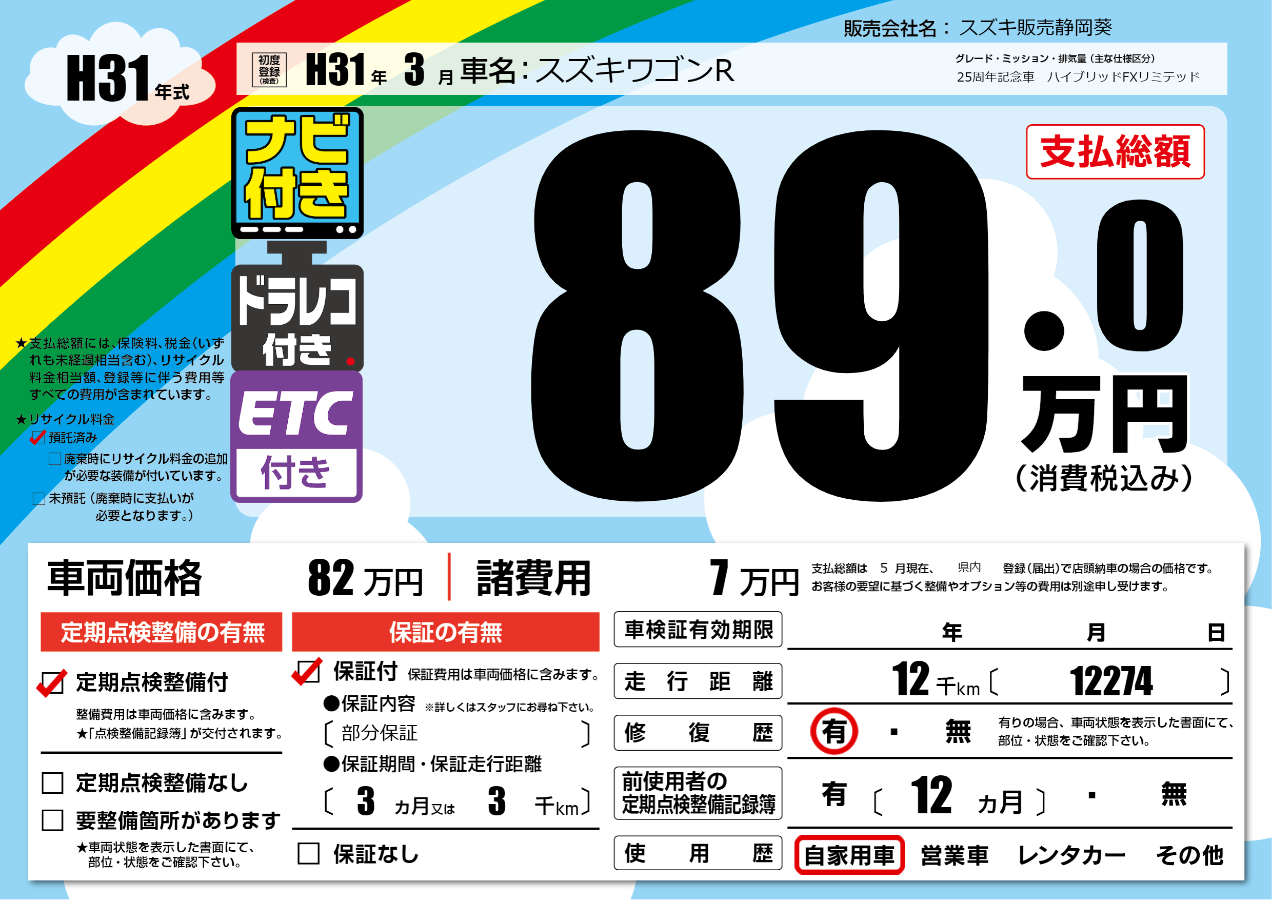 | 車名 | スズキワゴンR | グレード ミッション 排気量 |