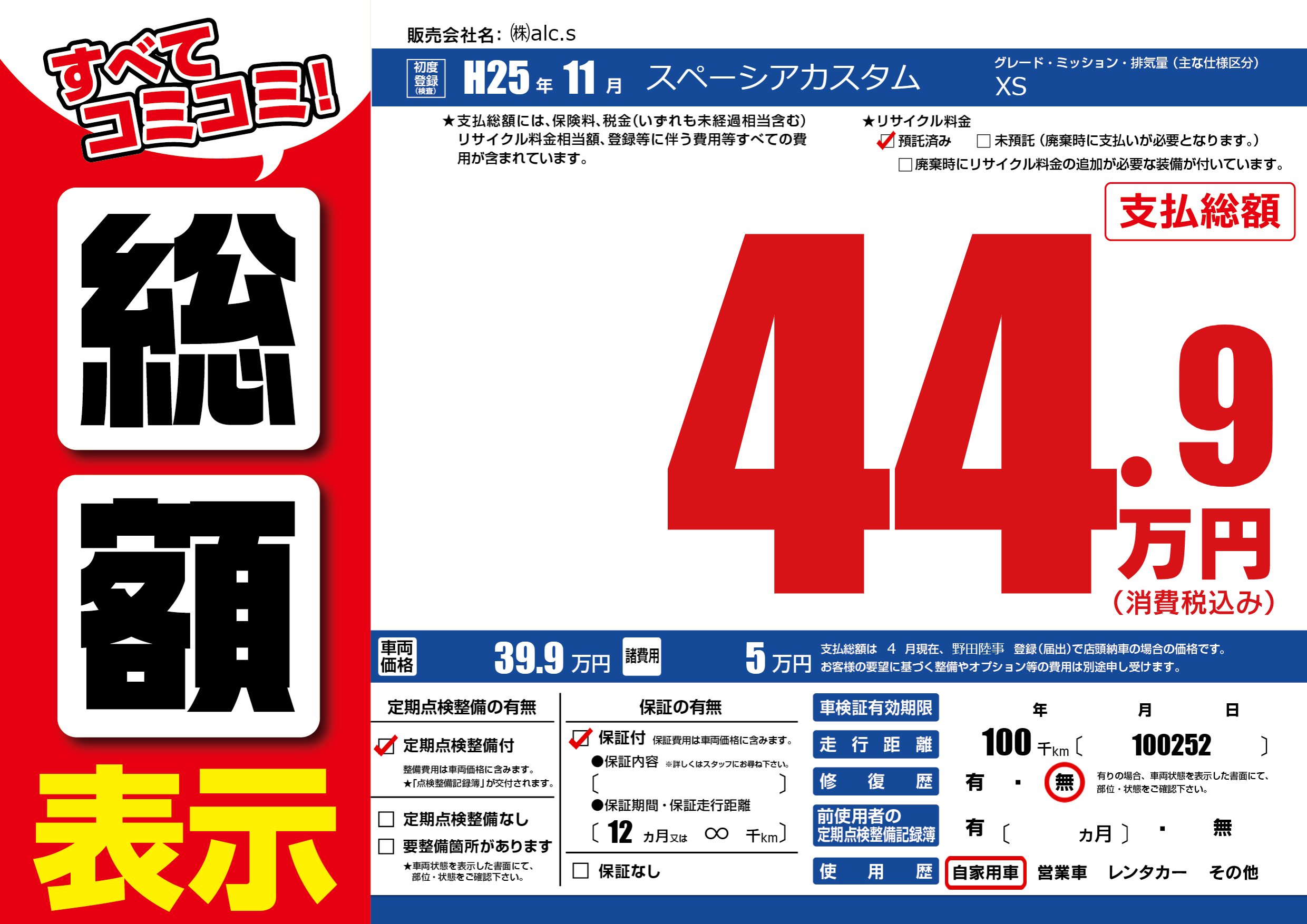 | 走行キロ | 10万km | 初年度登録 | H25年11月 |