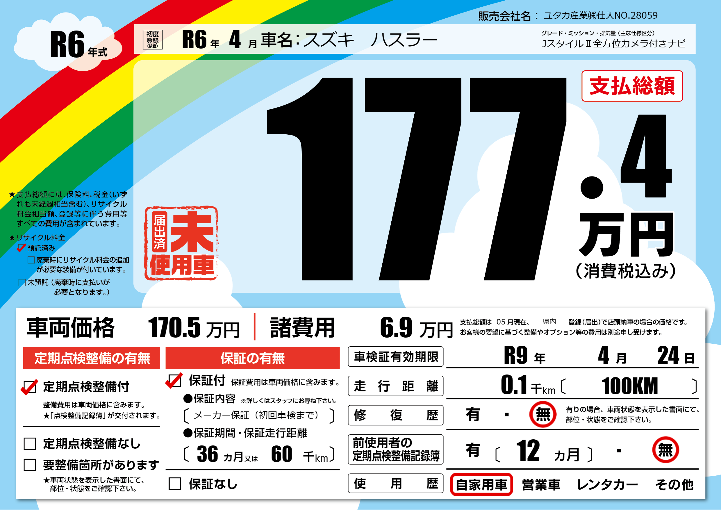 | 車名 | スズキ ハスラー | グレード ミッション 排気量 |