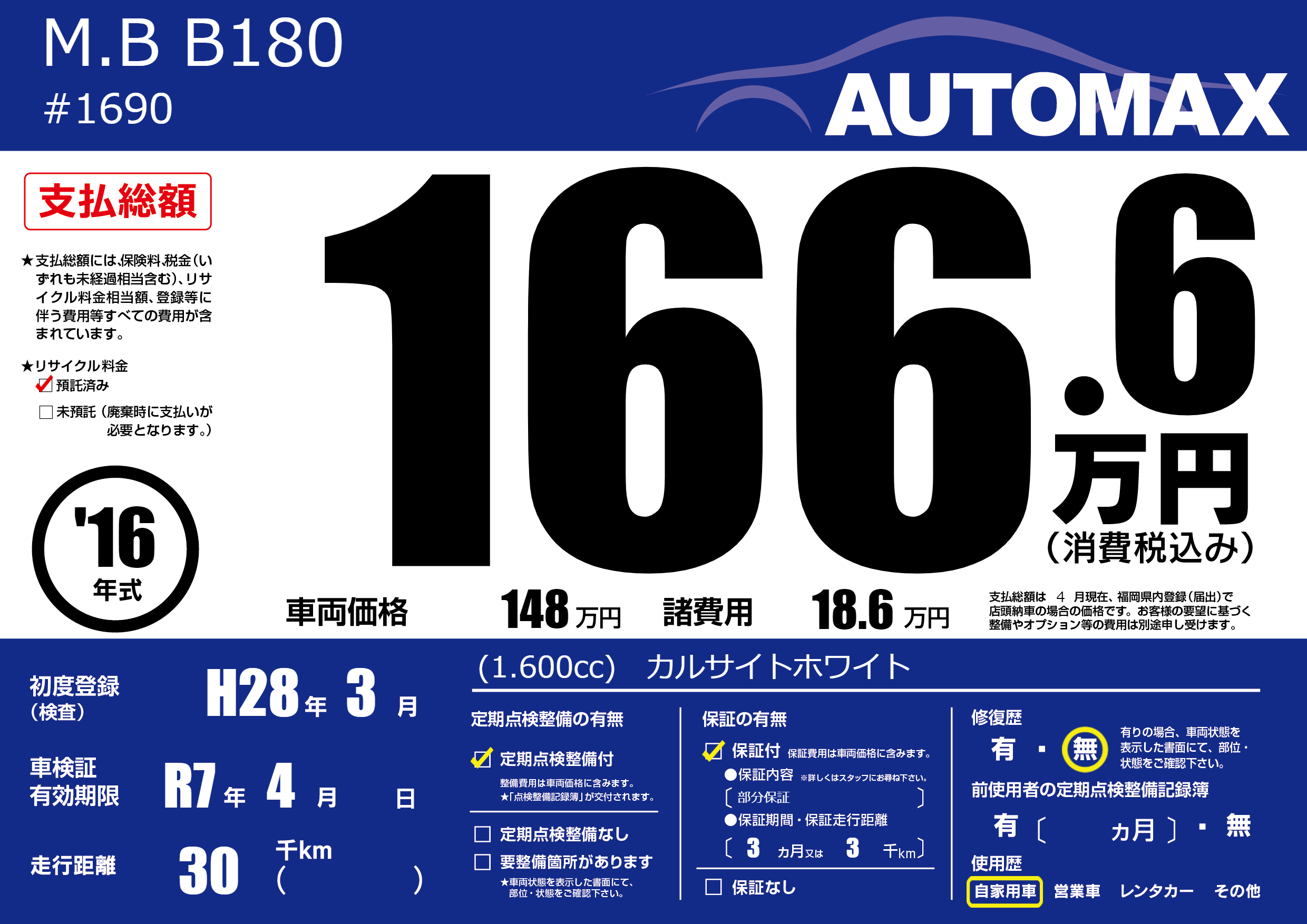 | 車名 | M.B B180 | グレード ミッション 排気量 |