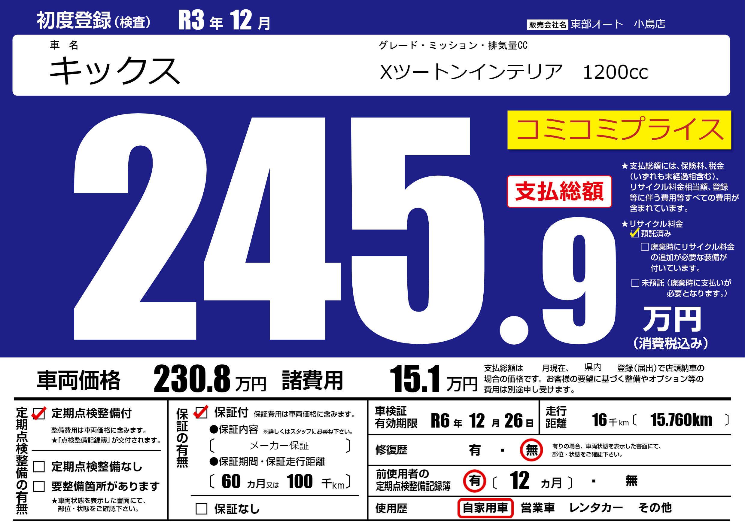 | 車検制限 | R6年 12月 26日 | ||