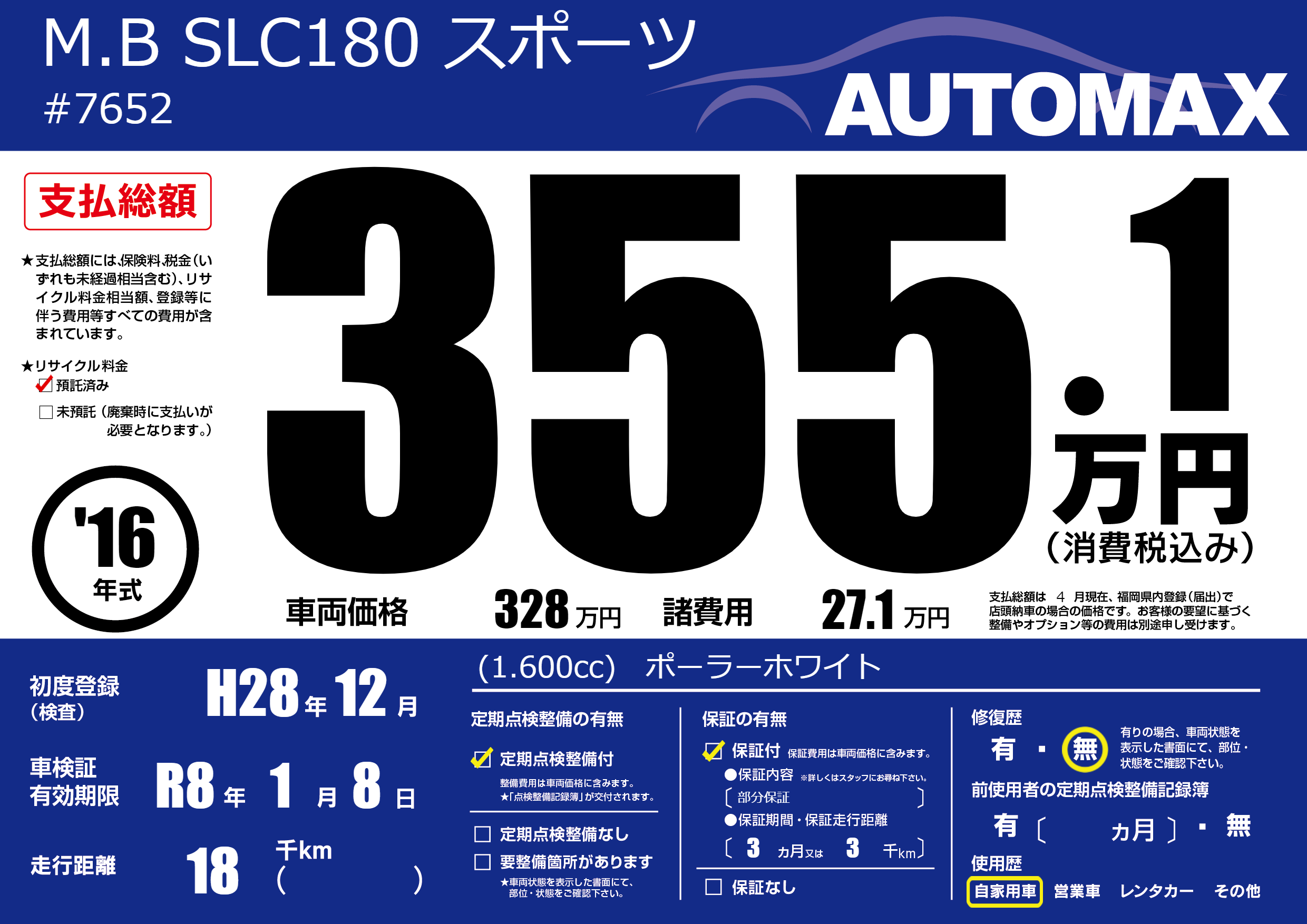 | 車名 | M.B SLC180 スポーツ | グレード ミッション 排気量 |