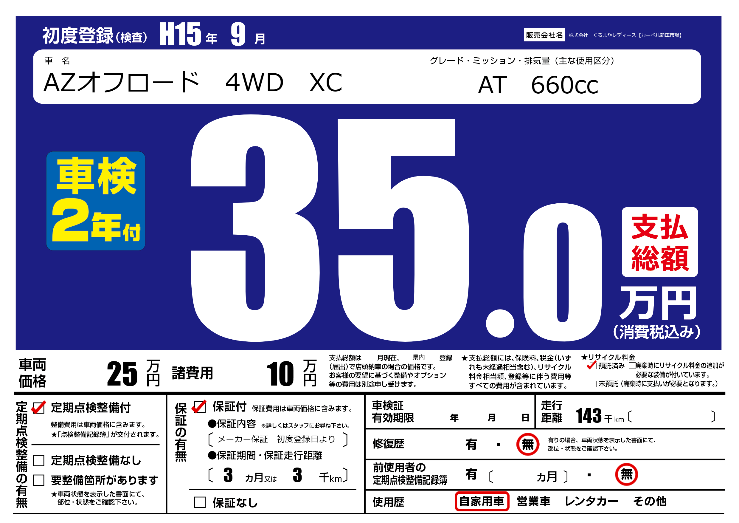 | 車名 | AZオフロード 4WD XC | グレード ミッション 排気量 |