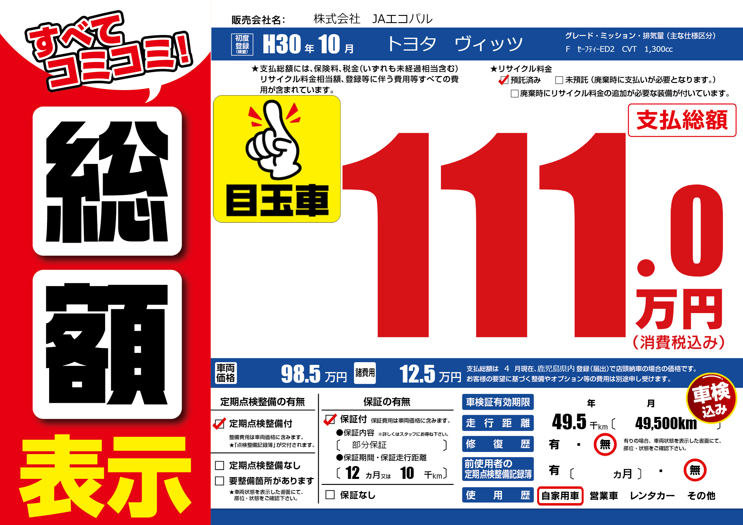 | 車名 | トヨタ ヴィッツ | グレード ミッション 排気量 |
