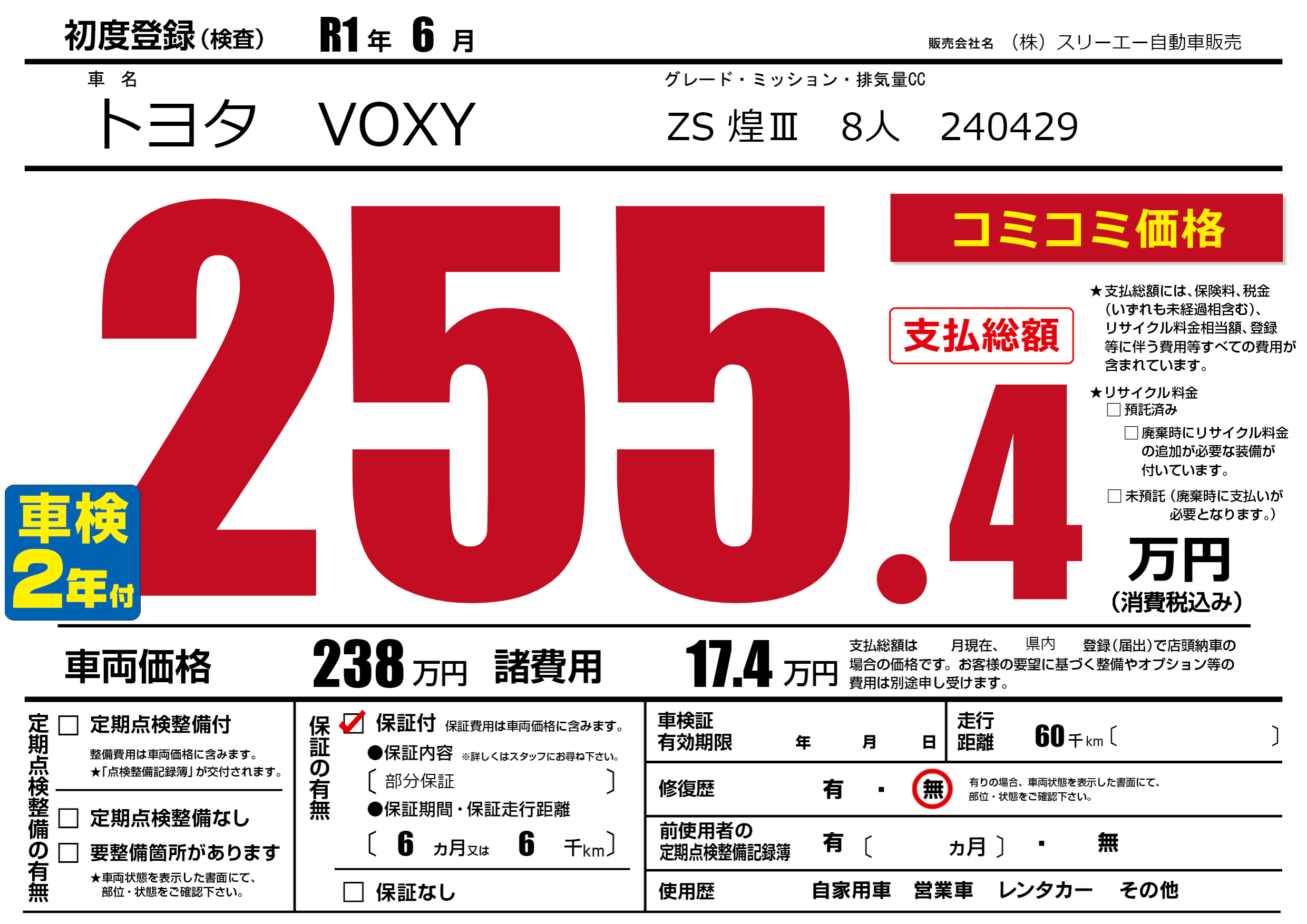 | 車名 | トヨタ VOXY | グレード ミッション 排気量 |