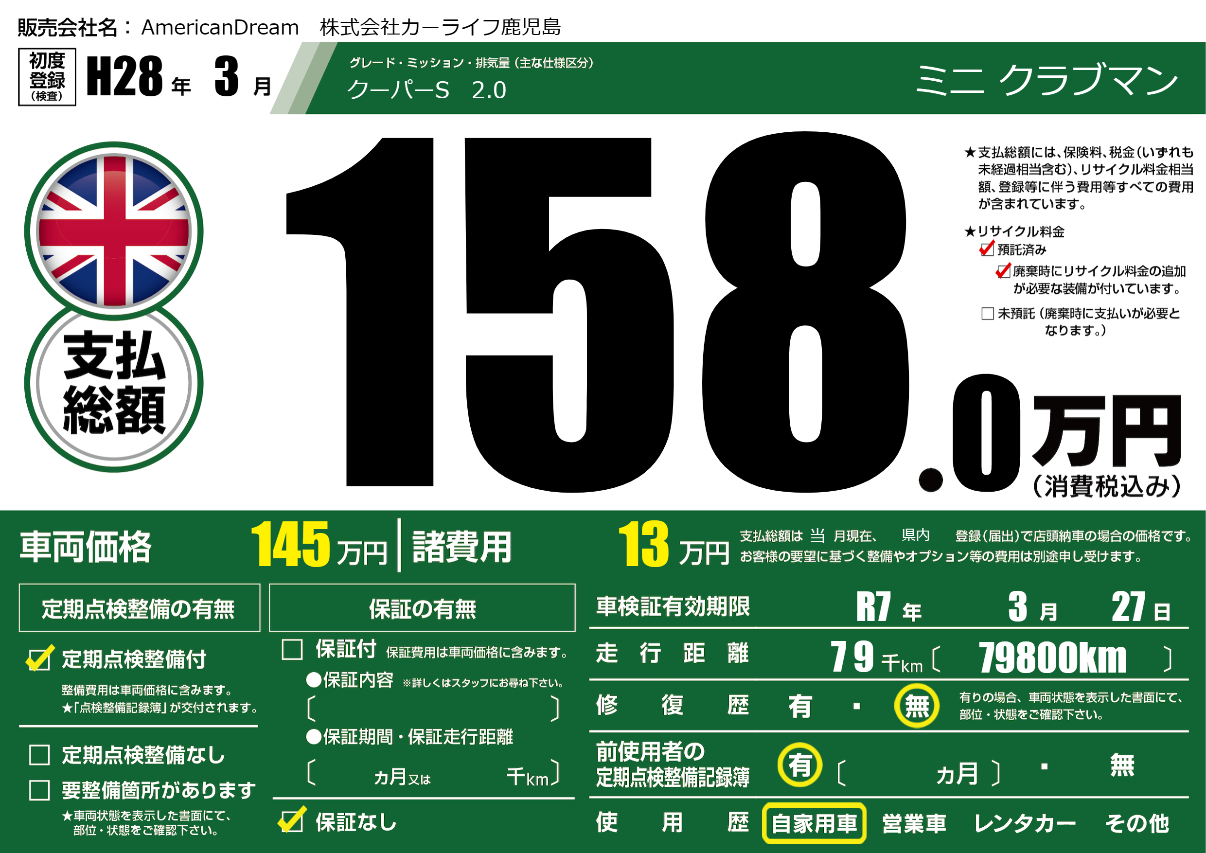 | 車名 | ミニ クラブマン | グレード ミッション 排気量 |