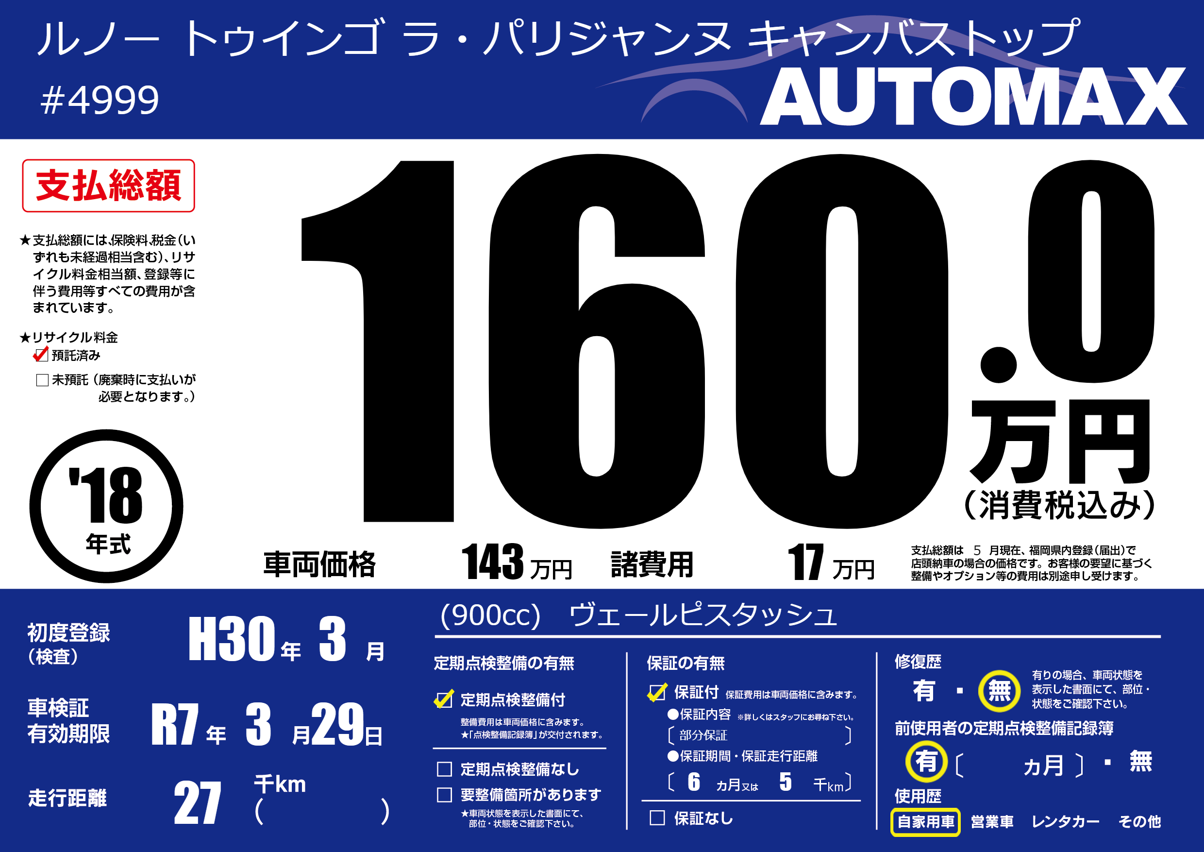 | 車名 | ルノー トゥインゴ ラ・パリジャンヌ キャンバストップ | グレード ミッション 排気量 |
