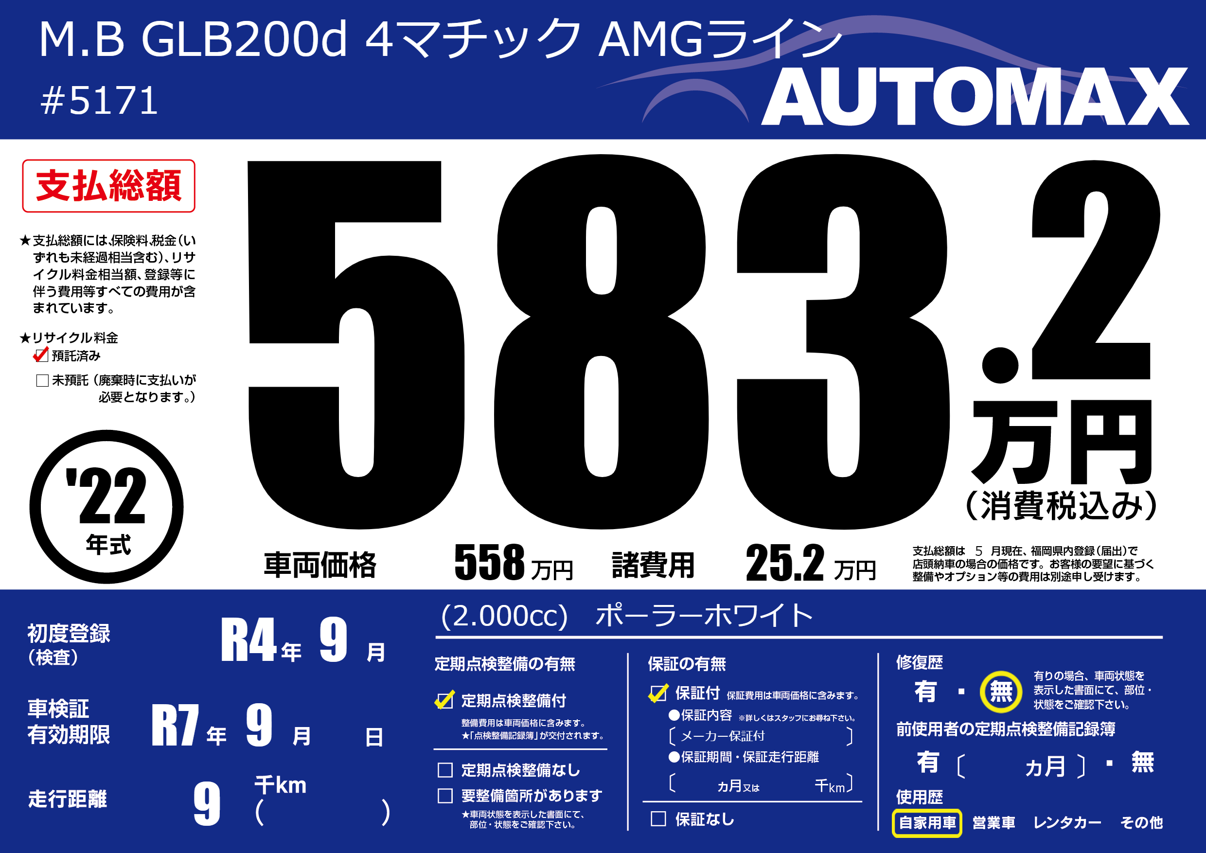 | 車名 | M.B GLB200d 4マチック AMGライン | グレード ミッション 排気量 |