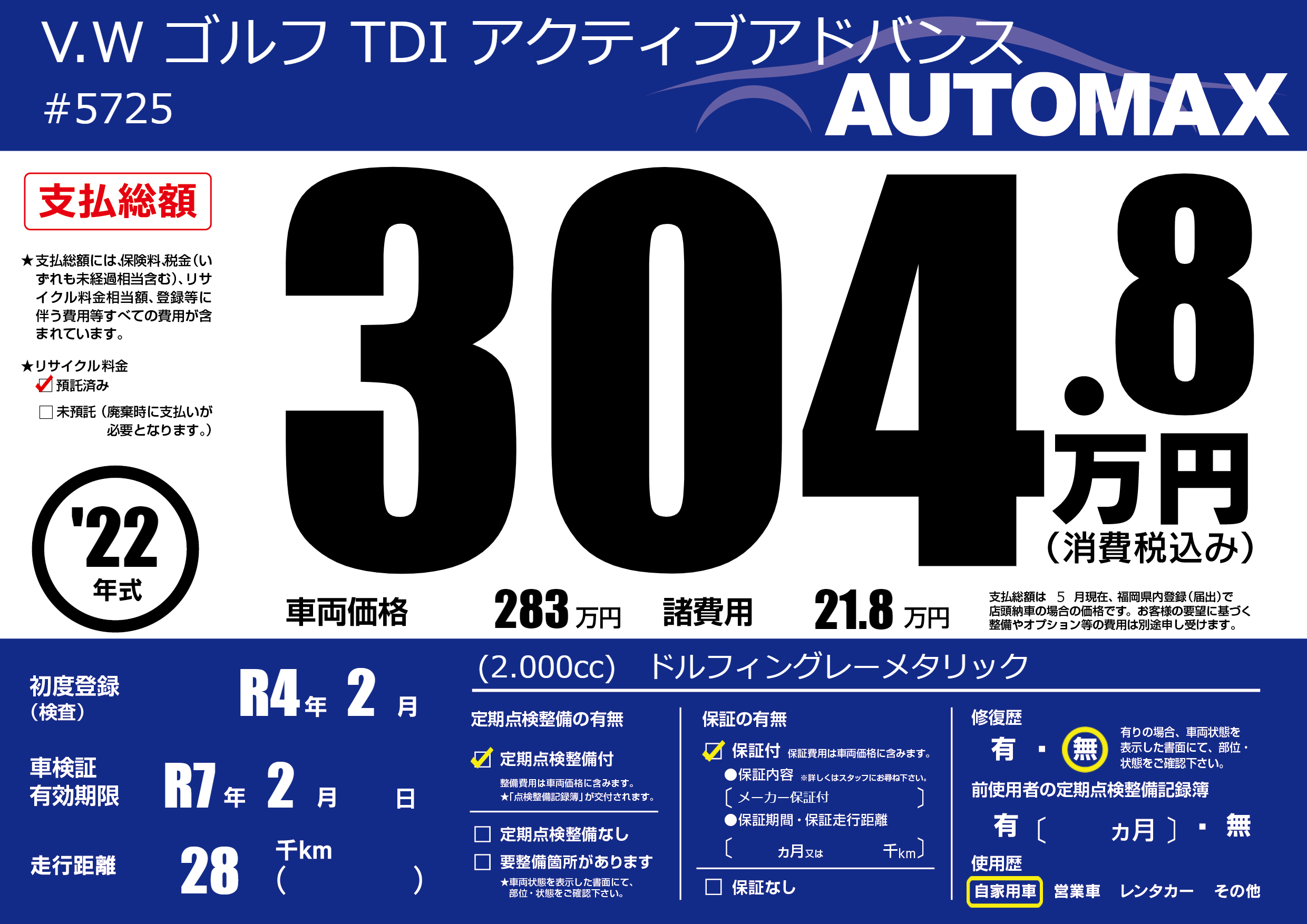 | 車名 | V.W ゴルフ TDI アクティブアドバンス | グレード ミッション 排気量 |