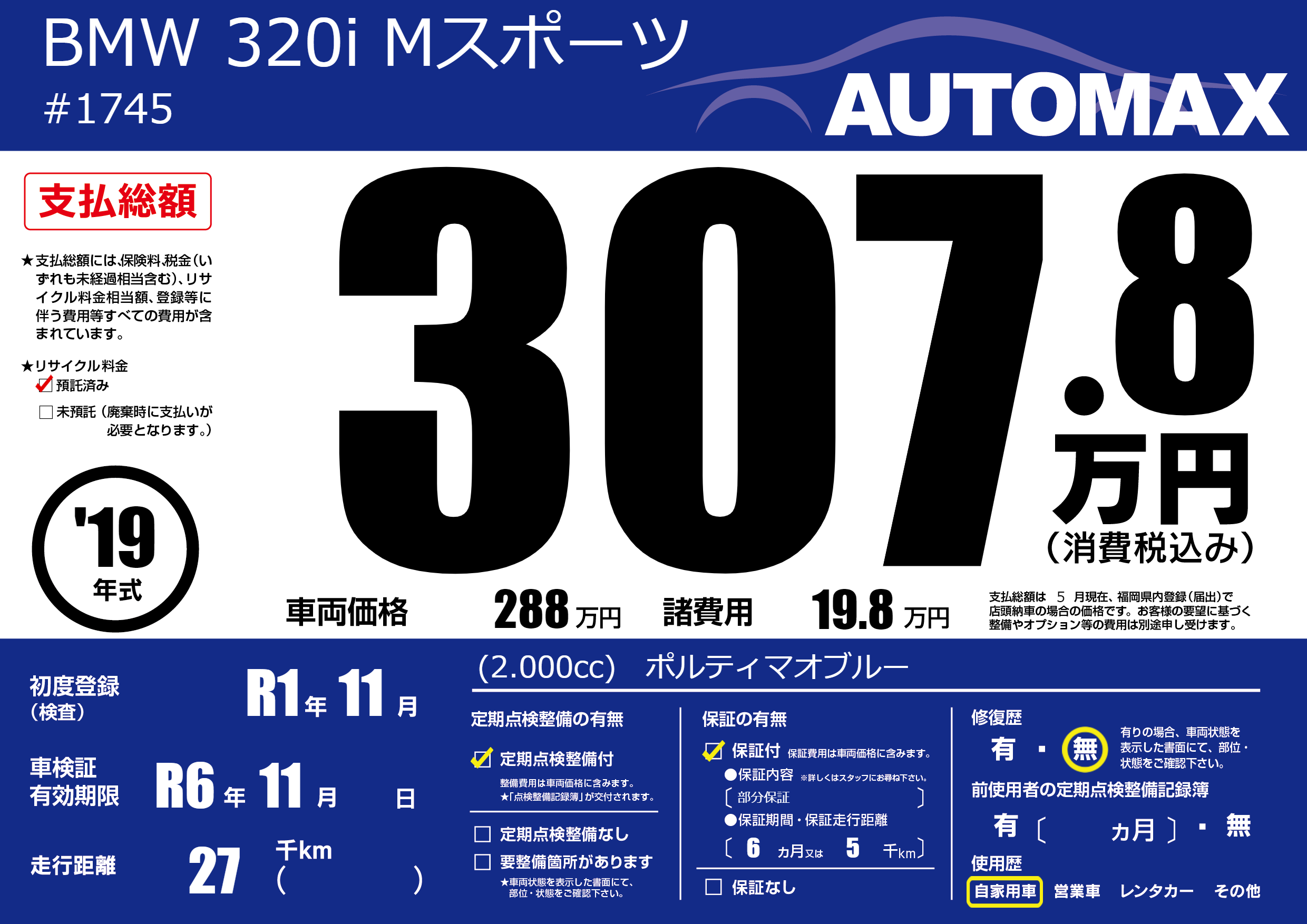 | 車名 | BMW 320i Mスポーツ | グレード ミッション 排気量 |