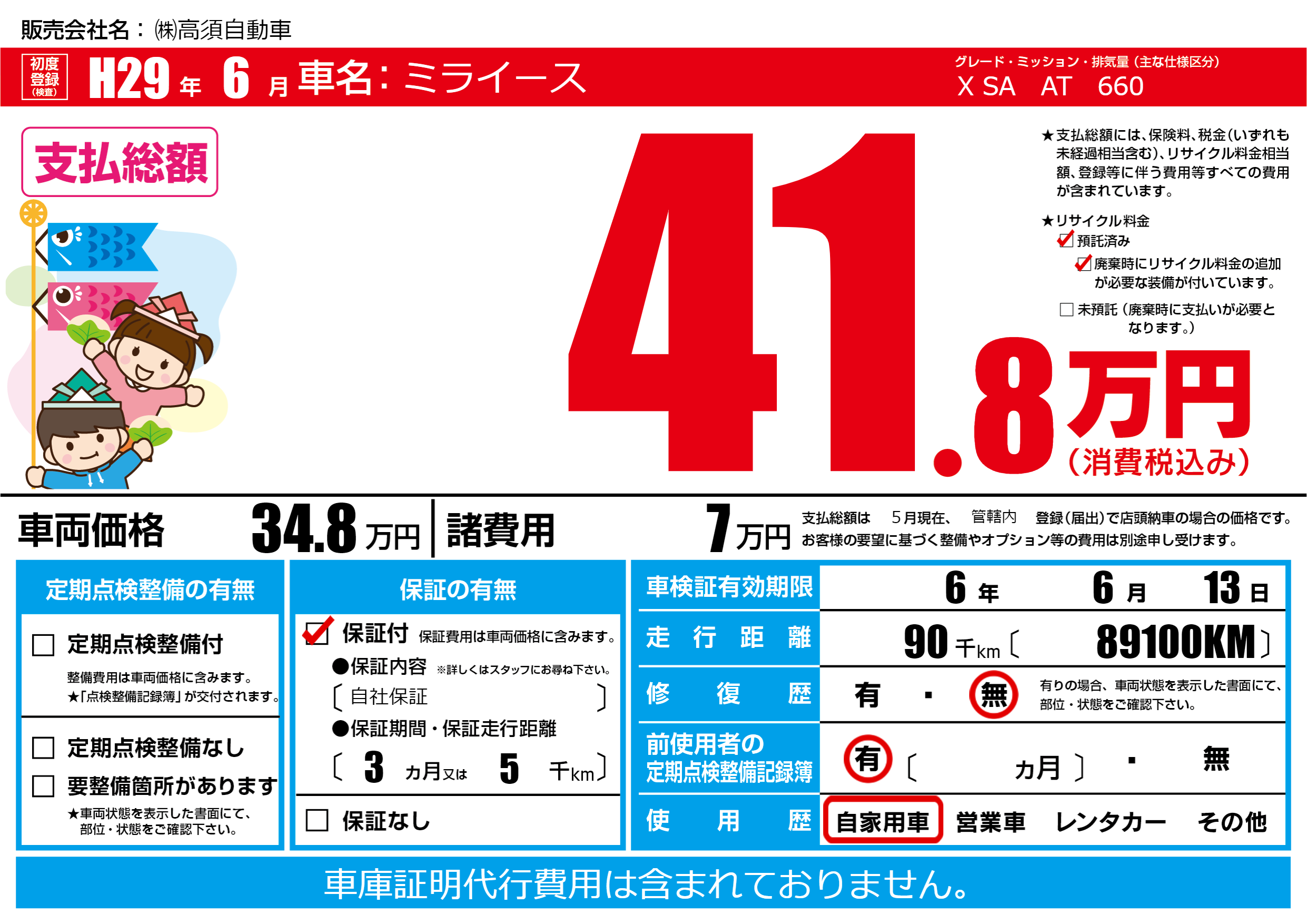 | 走行キロ | 9万km | 初年度登録 | H29年6月 |