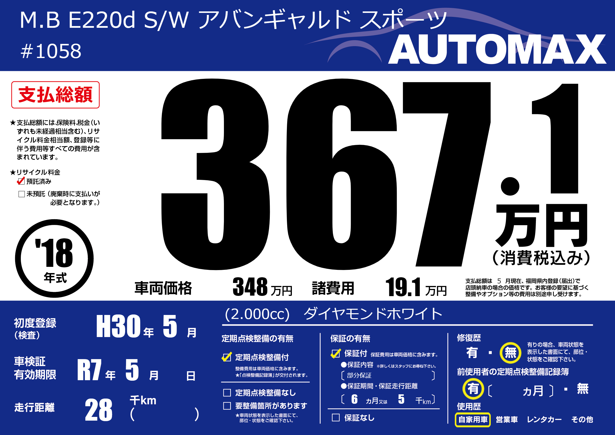 | 車名 | M.B E220d S/W アバンギャルド スポーツ | グレード ミッション 排気量 |