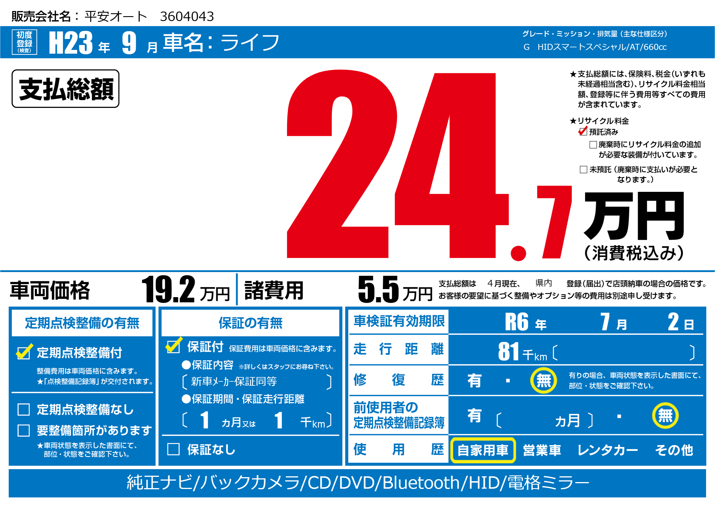 なし | 車検制限 | R6年7月2月 |