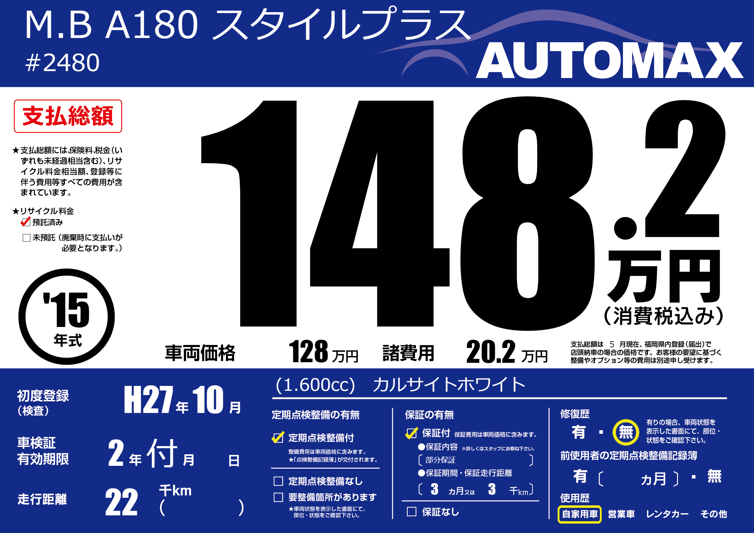 | 車名 | M.B A180 スタイルプラス | グレード ミッション 排気量 |