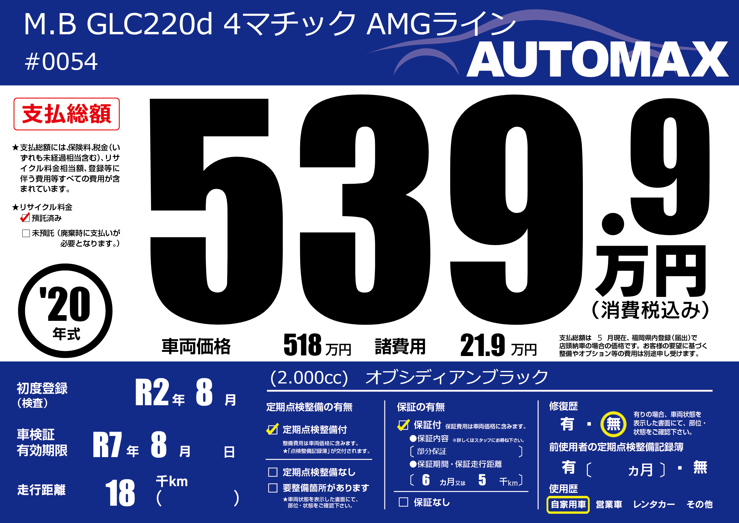 | 車名 | M.B GLC220d 4マチック AMGライン | グレード ミッション 排気量 |