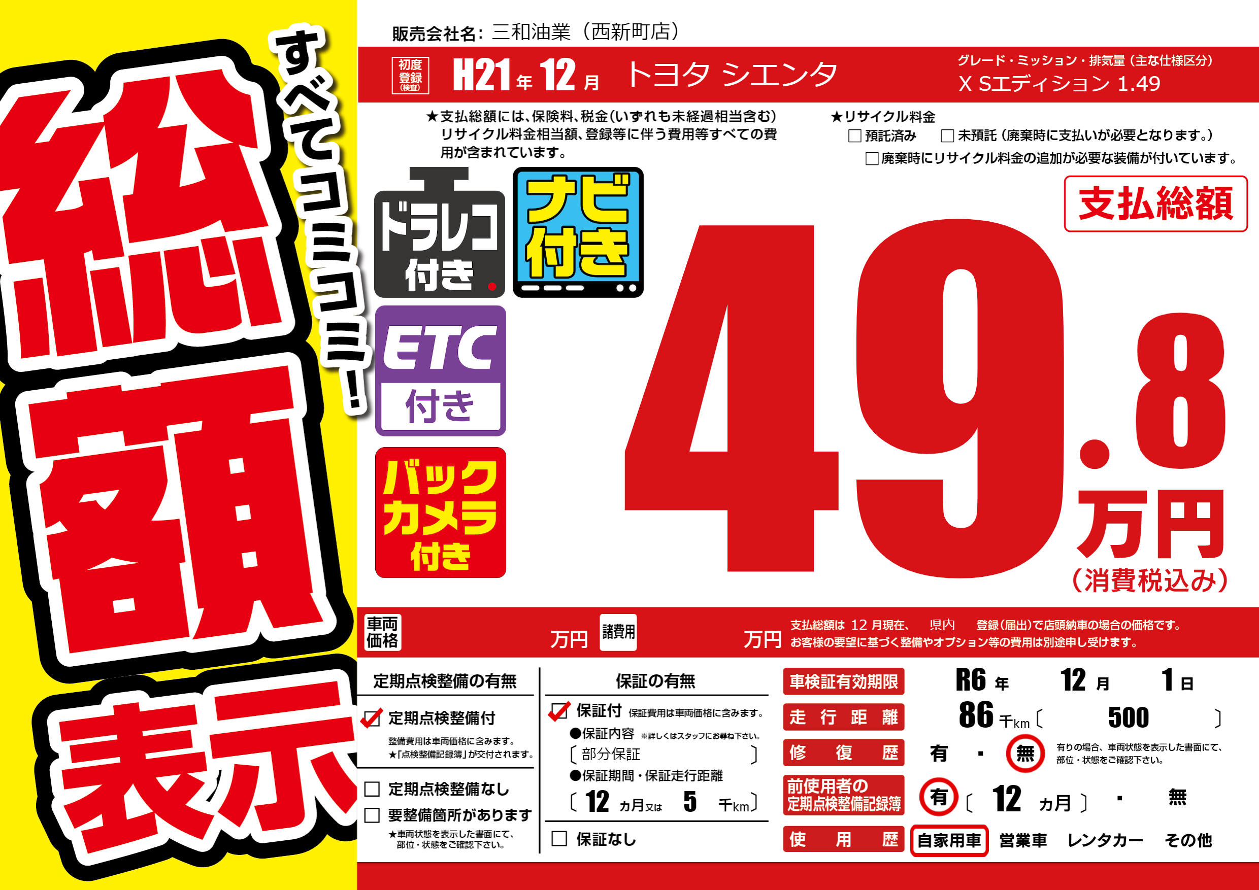 | 車名 | トヨタ シエンタ | グレード ミッション 排気量 |
