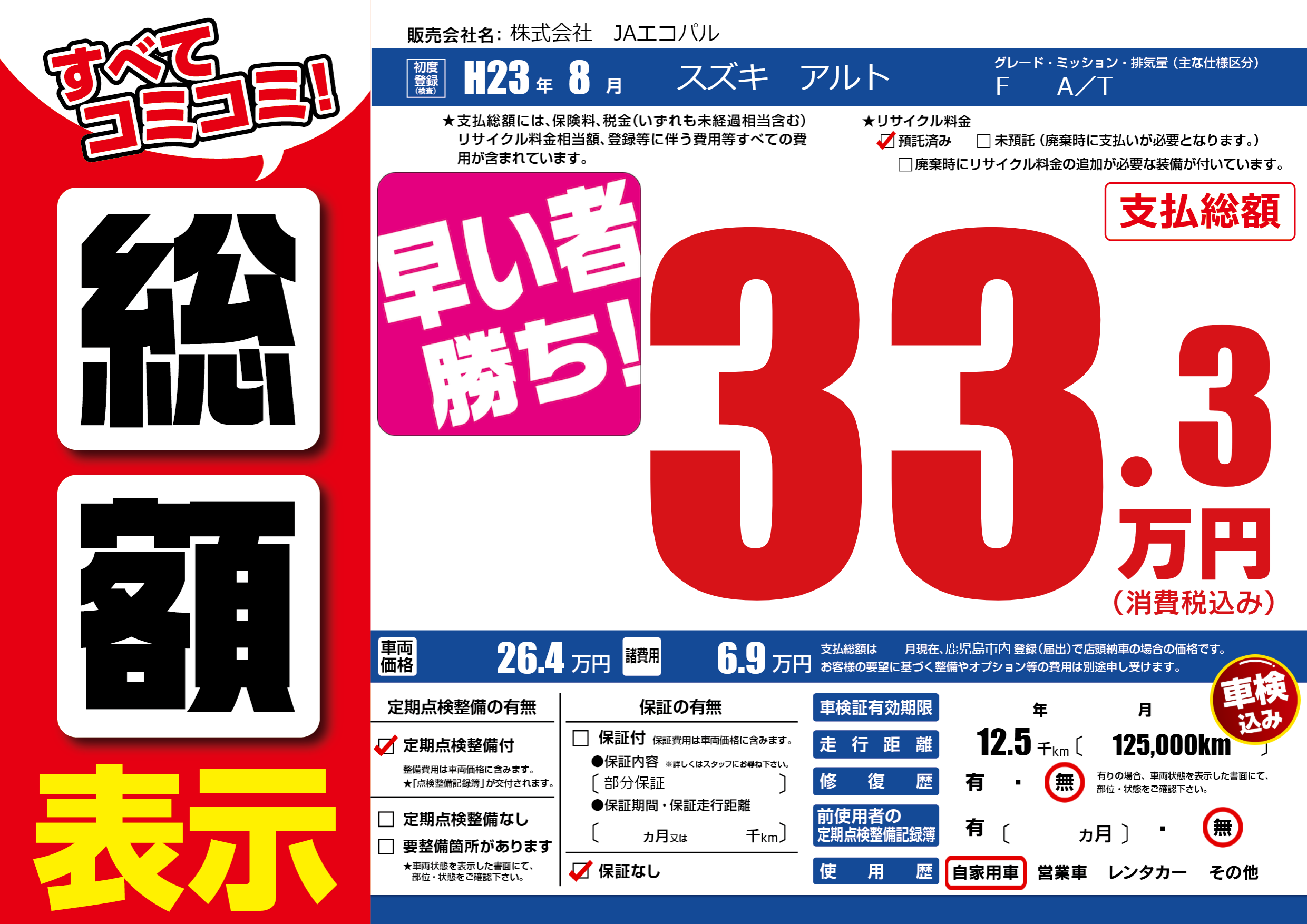 | 車名 | スズキ アルト | グレード ミッション 排気量 |