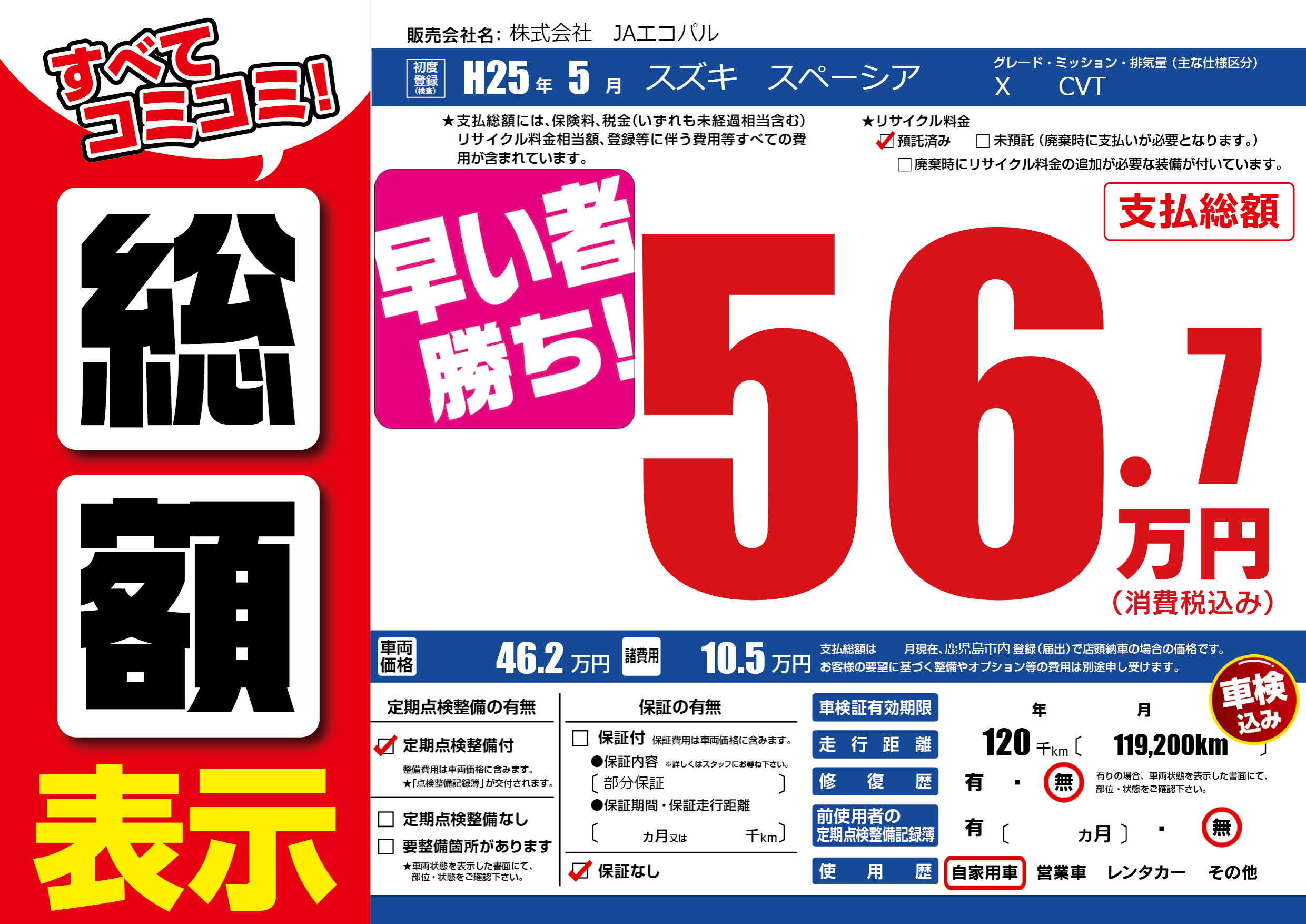 | 走行キロ | 12万km | 初年度登録 | H25年5月 |
