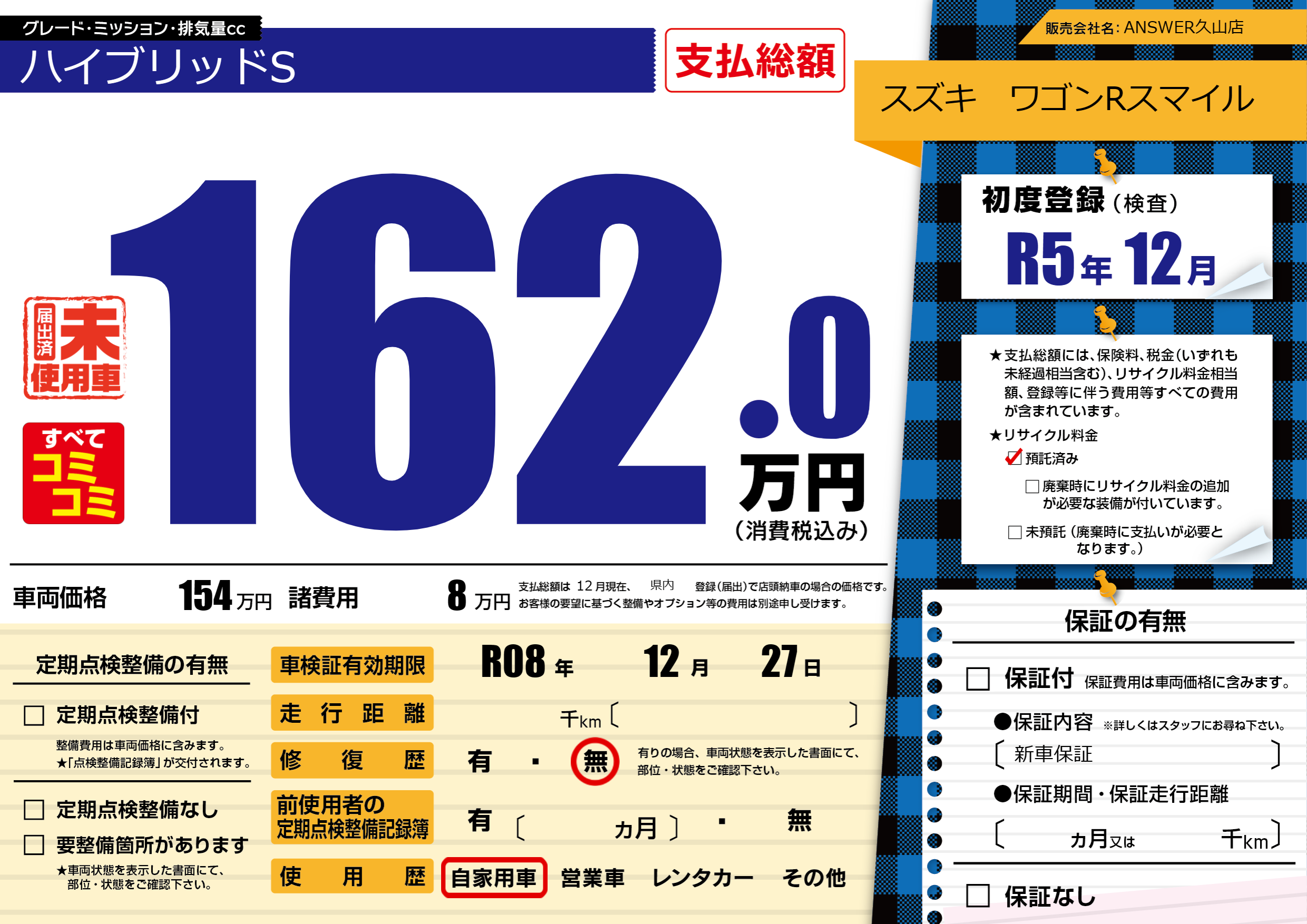 保証なし 保証内容(新車保証) ---ヶ月または()千kmまで |