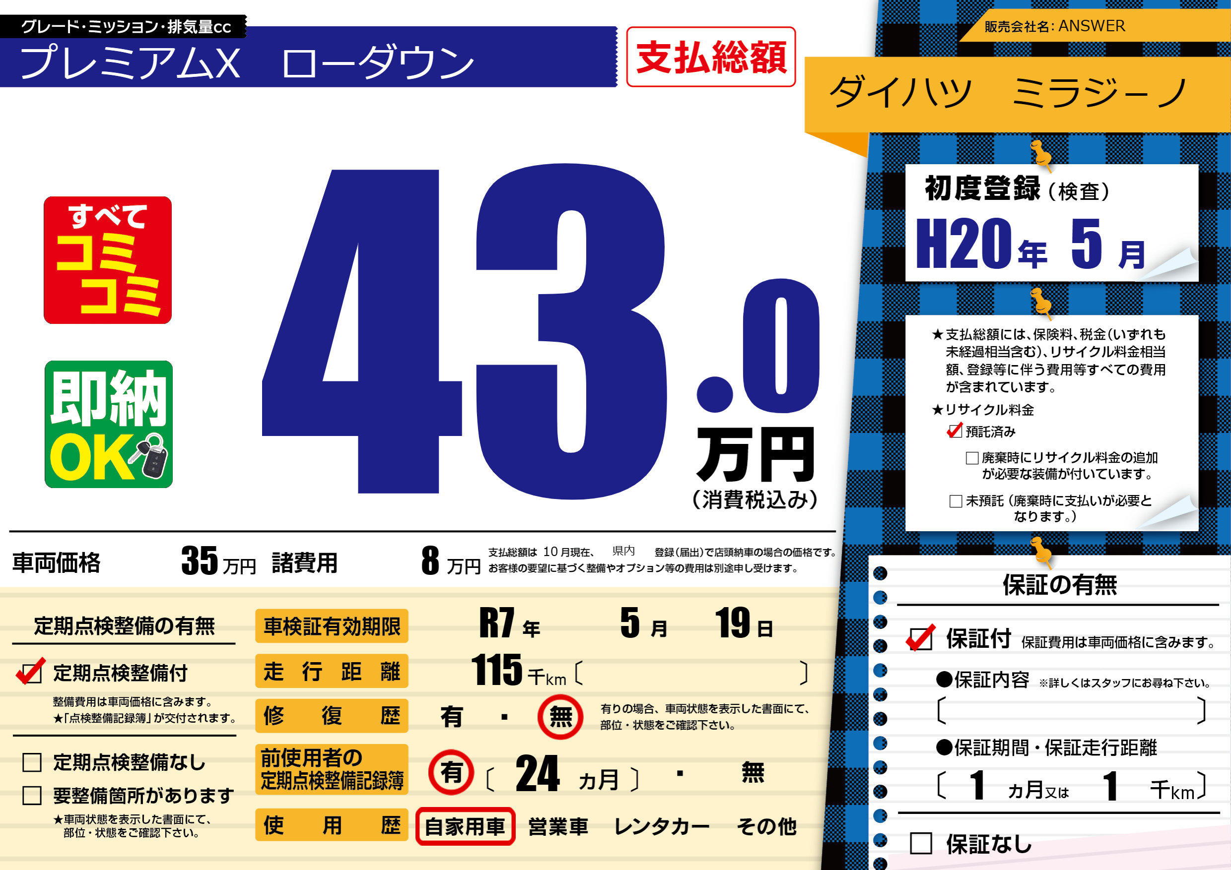| 車名 | ダイハツ ミラジ-ノ | グレード ミッション 排気量 |