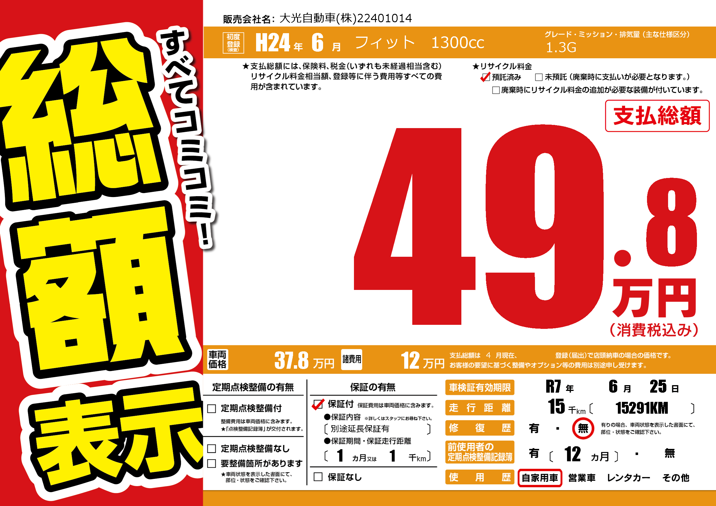 | 車名 | フィット 1300cc | グレード ミッション 排気量 |