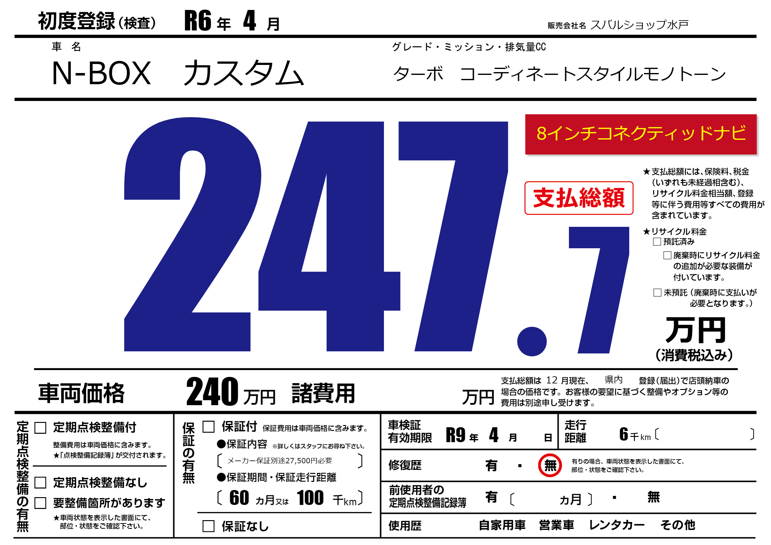 | 車名 | N-BOX カスタム | グレード ミッション 排気量 |