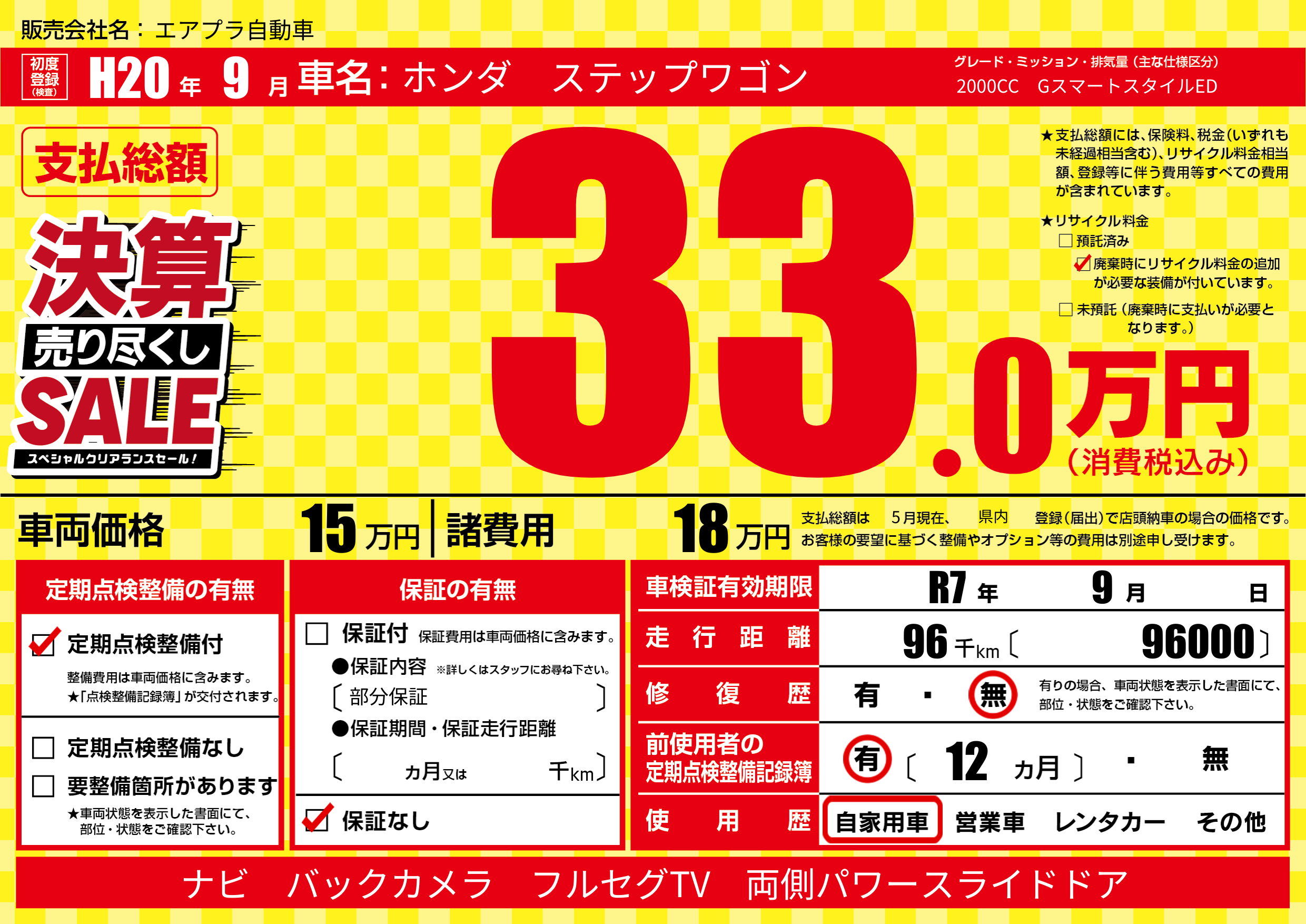 | 走行キロ | 9.6万km | 初年度登録 | H20年9月 |