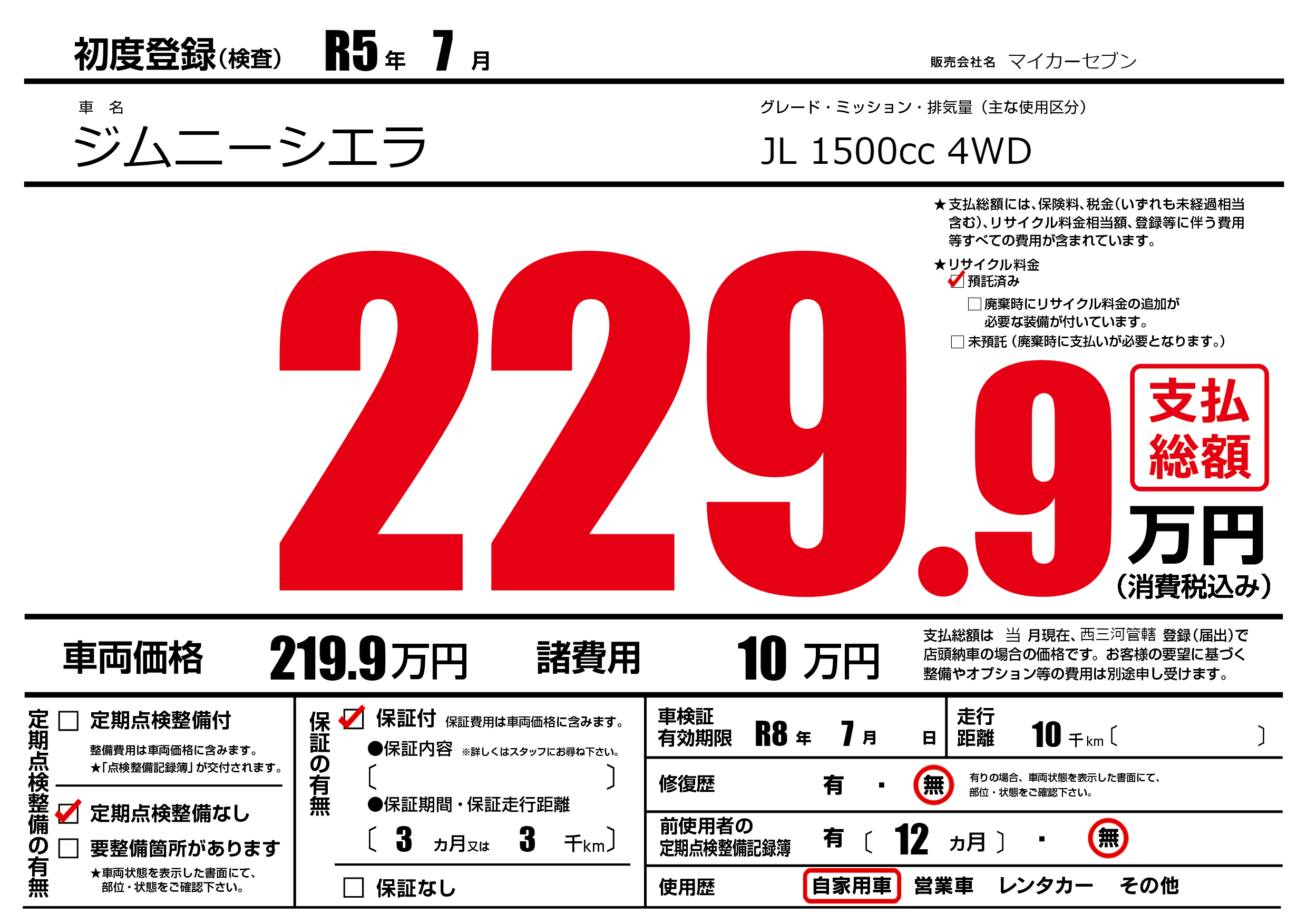 | 車名 | ジムニーシエラ | グレード ミッション 排気量 |