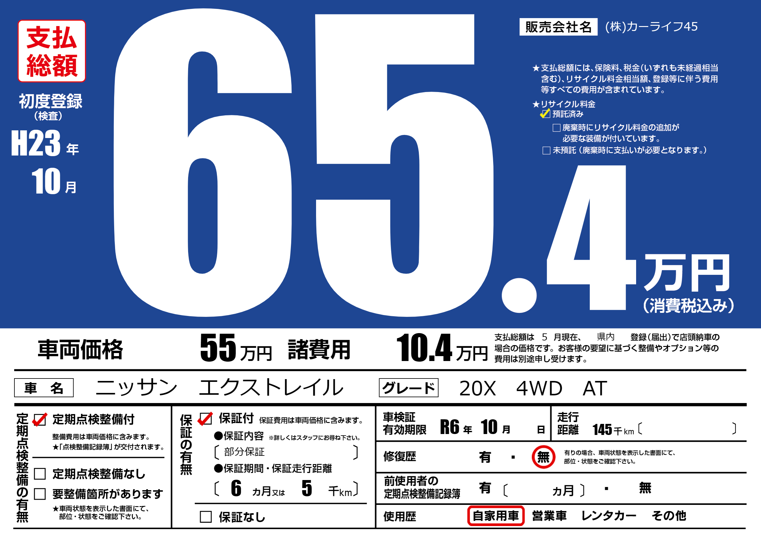 | 走行キロ | 14.5万km | 初年度登録 | H23年10月 |