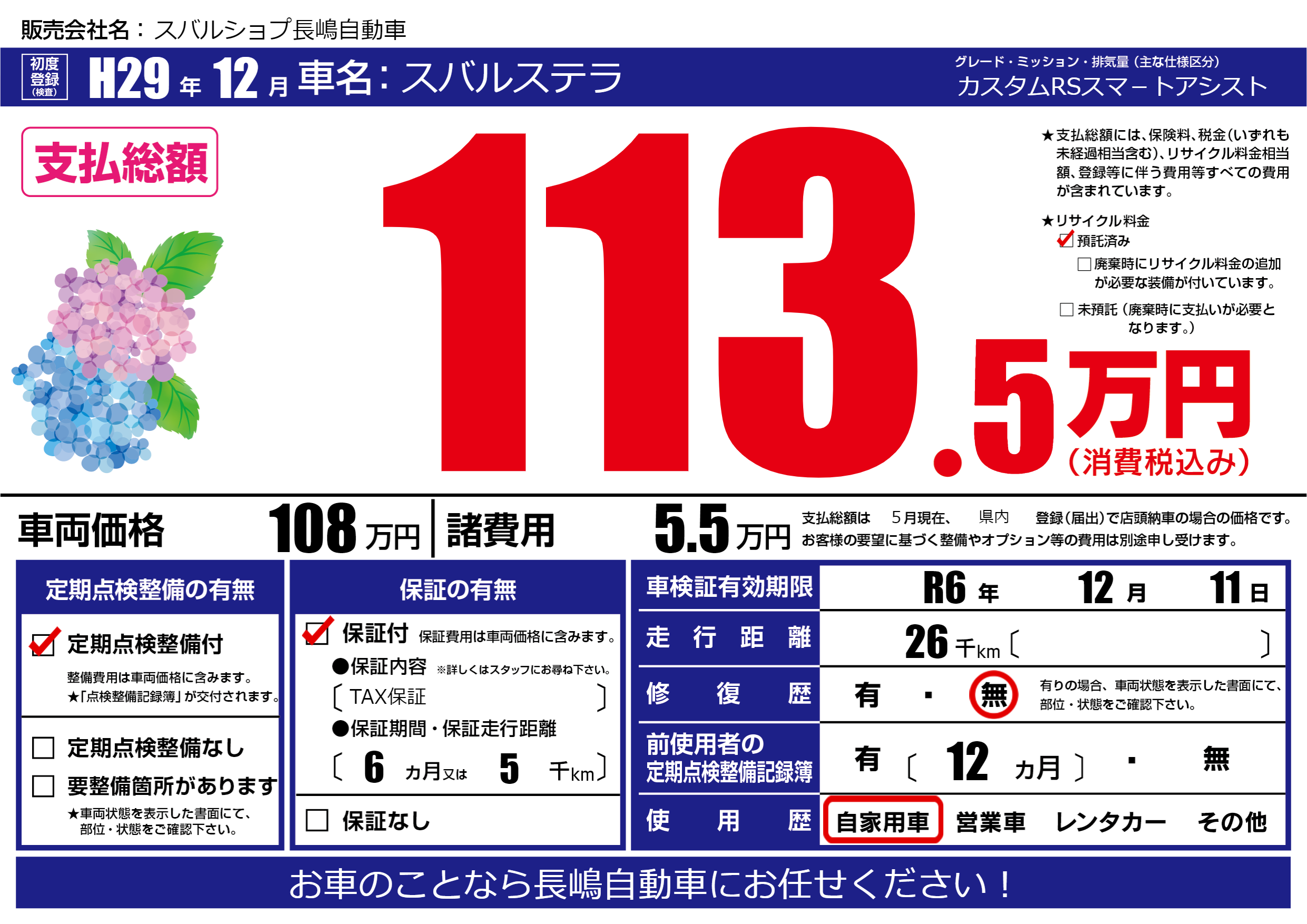 保証付き 保証内容(TAX保証) 6ヶ月または(5)千kmまで |