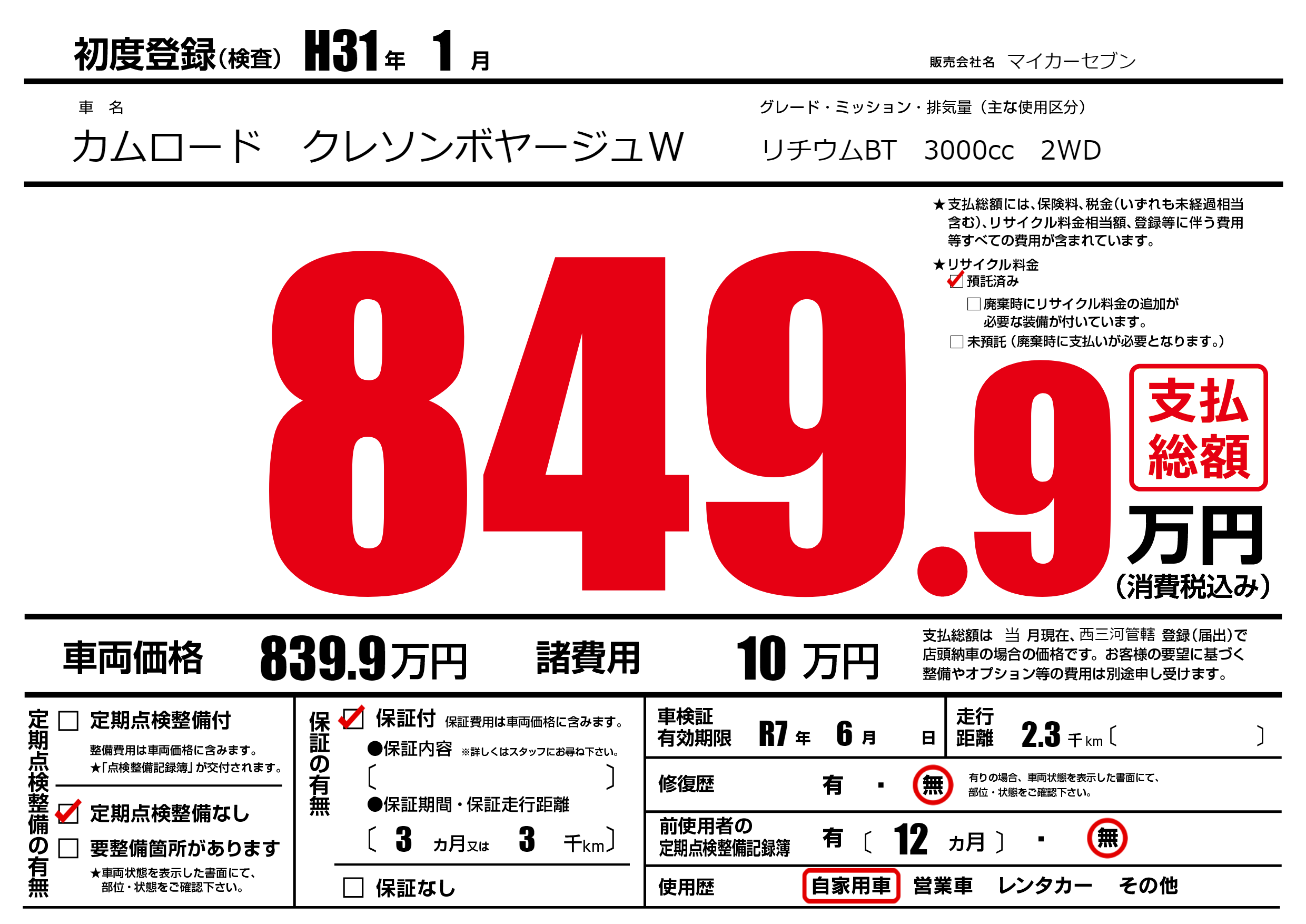 | 車名 | カムロード クレソンボヤージュW | グレード ミッション 排気量 |