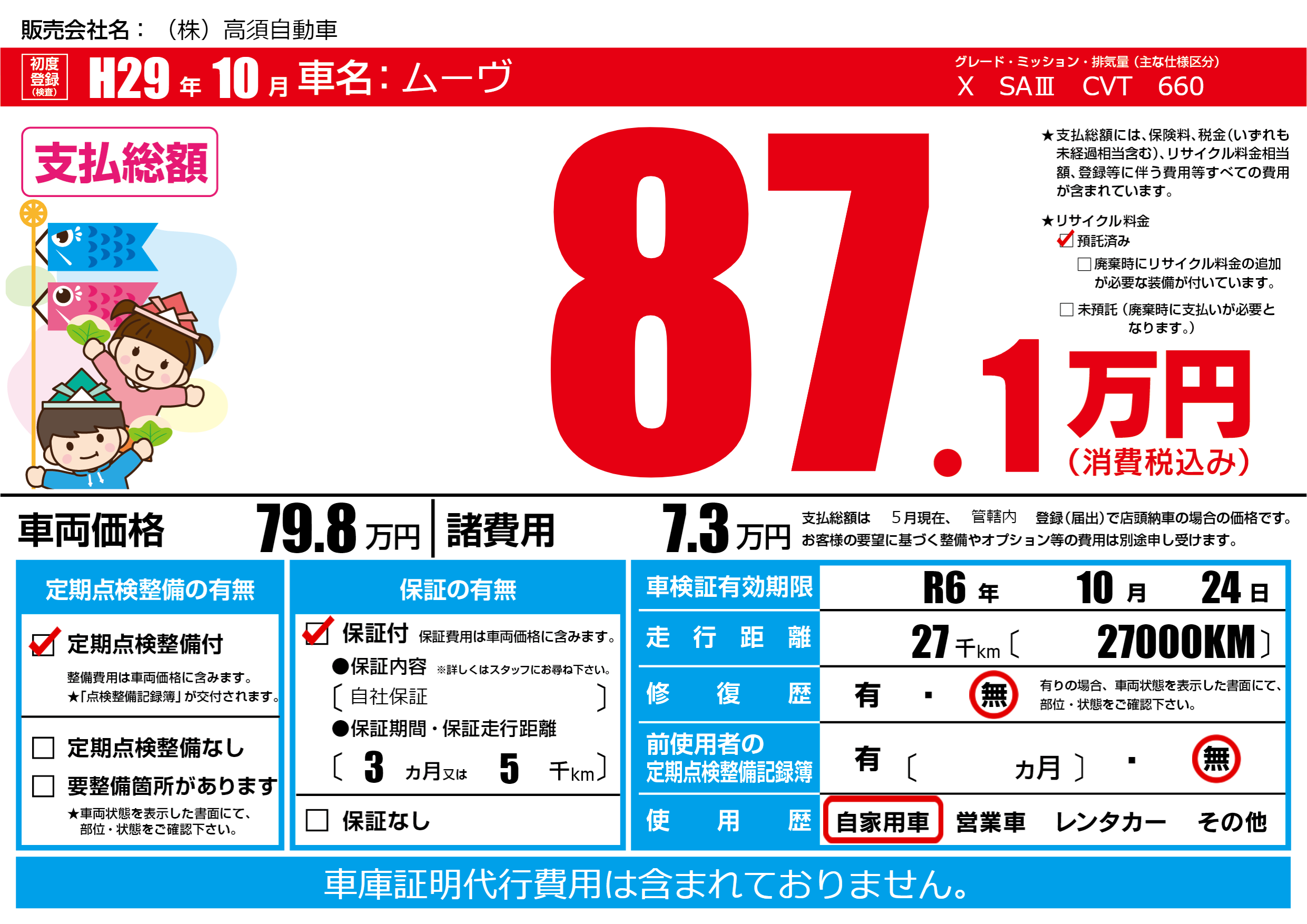 | 走行キロ | 2.7万km | 初年度登録 | H29年10月 |