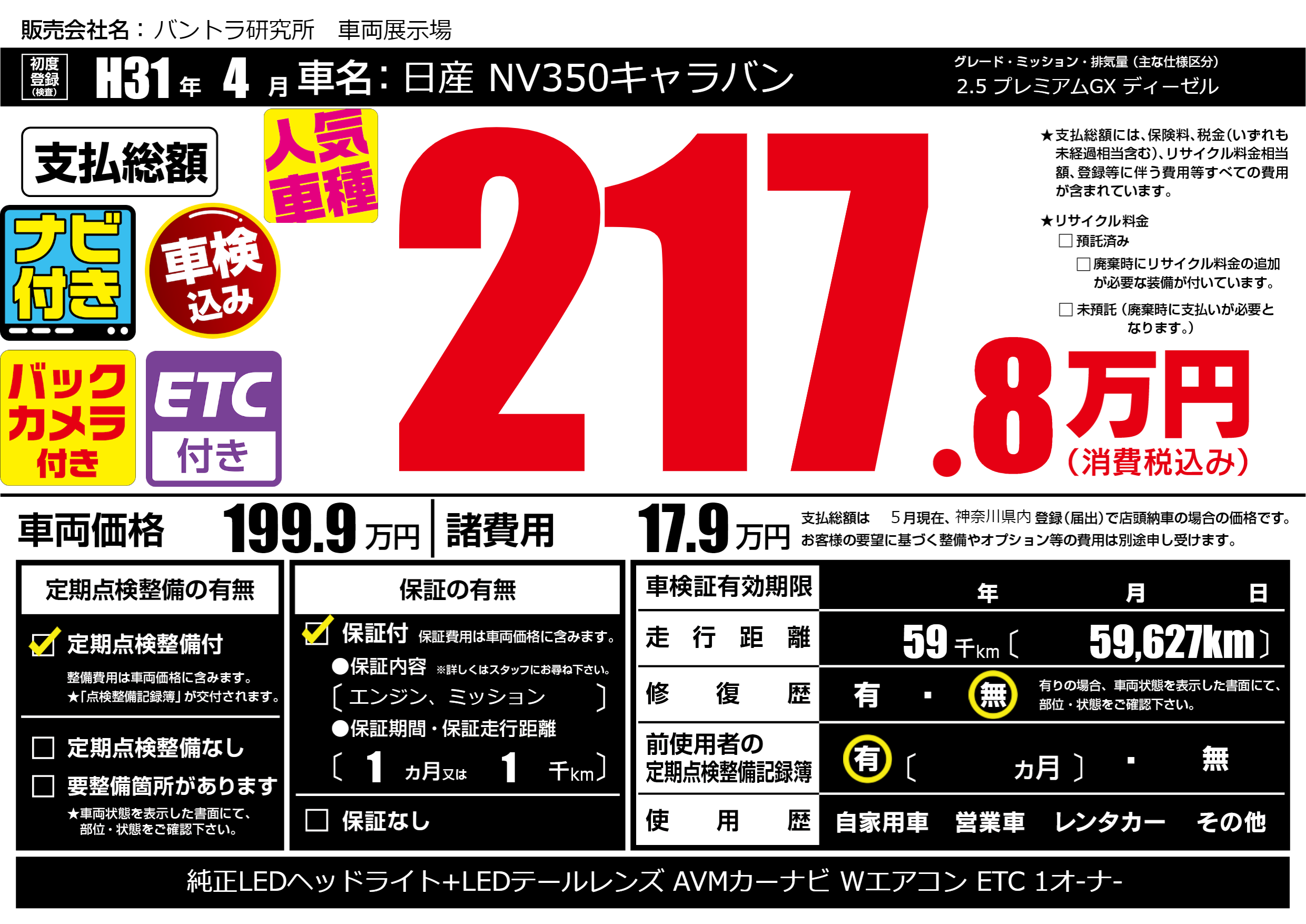 | 車名 | 日産 NV350キャラバン | グレード ミッション 排気量 |