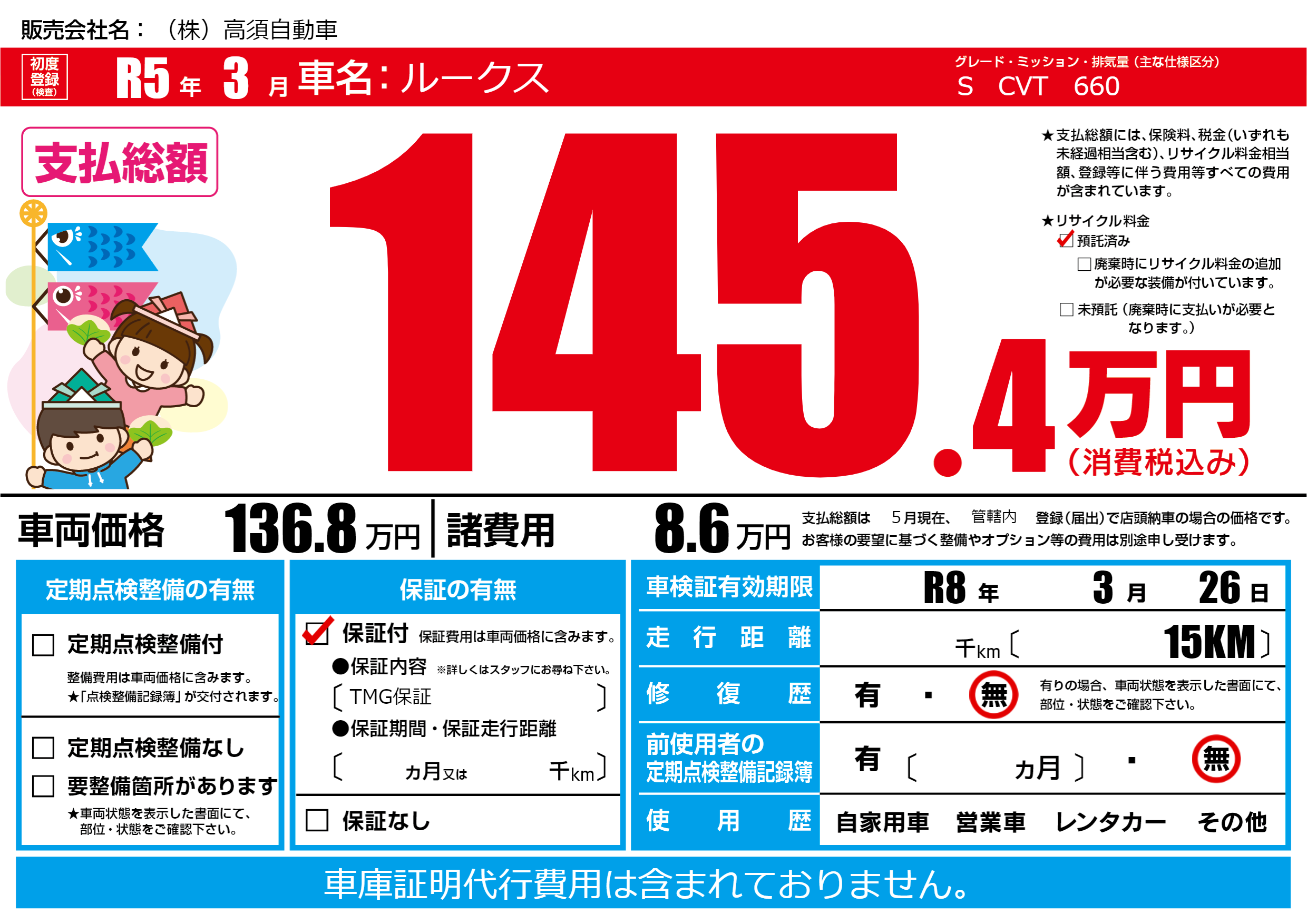 保証付き 保証内容(TMG保証) ---ヶ月または()千kmまで |