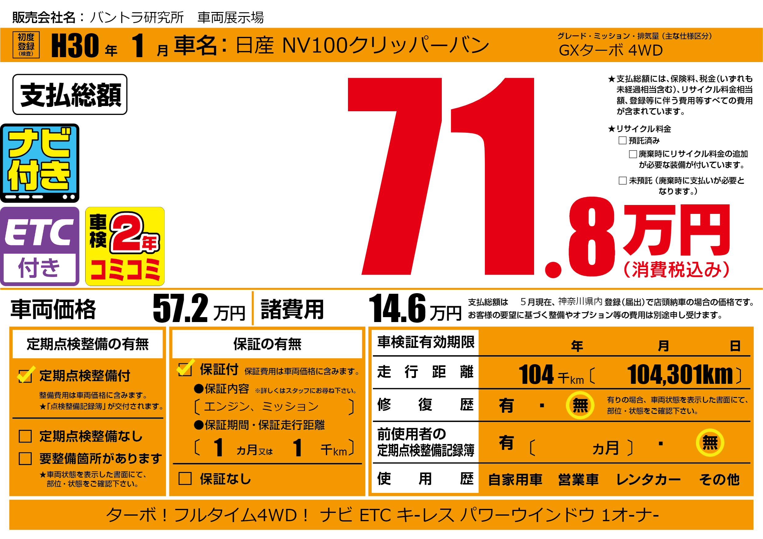 | 車名 | 日産 NV100クリッパーバン | グレード ミッション 排気量 |