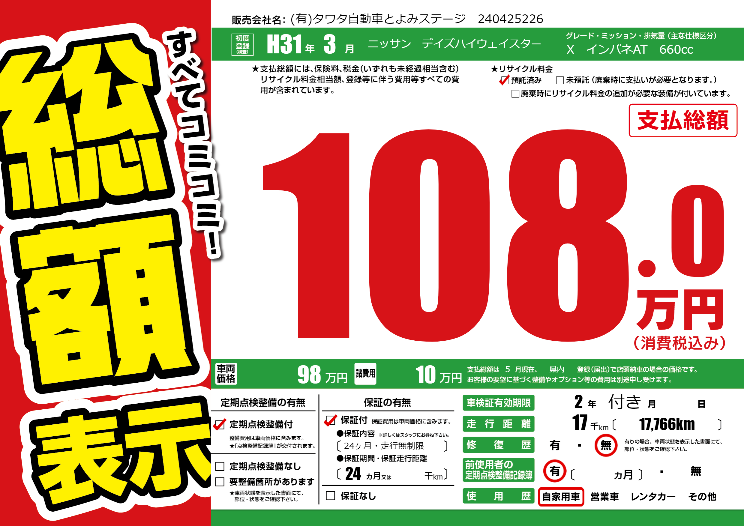 | 車名 | ニッサン デイズハイウェイスター | グレード ミッション 排気量 |