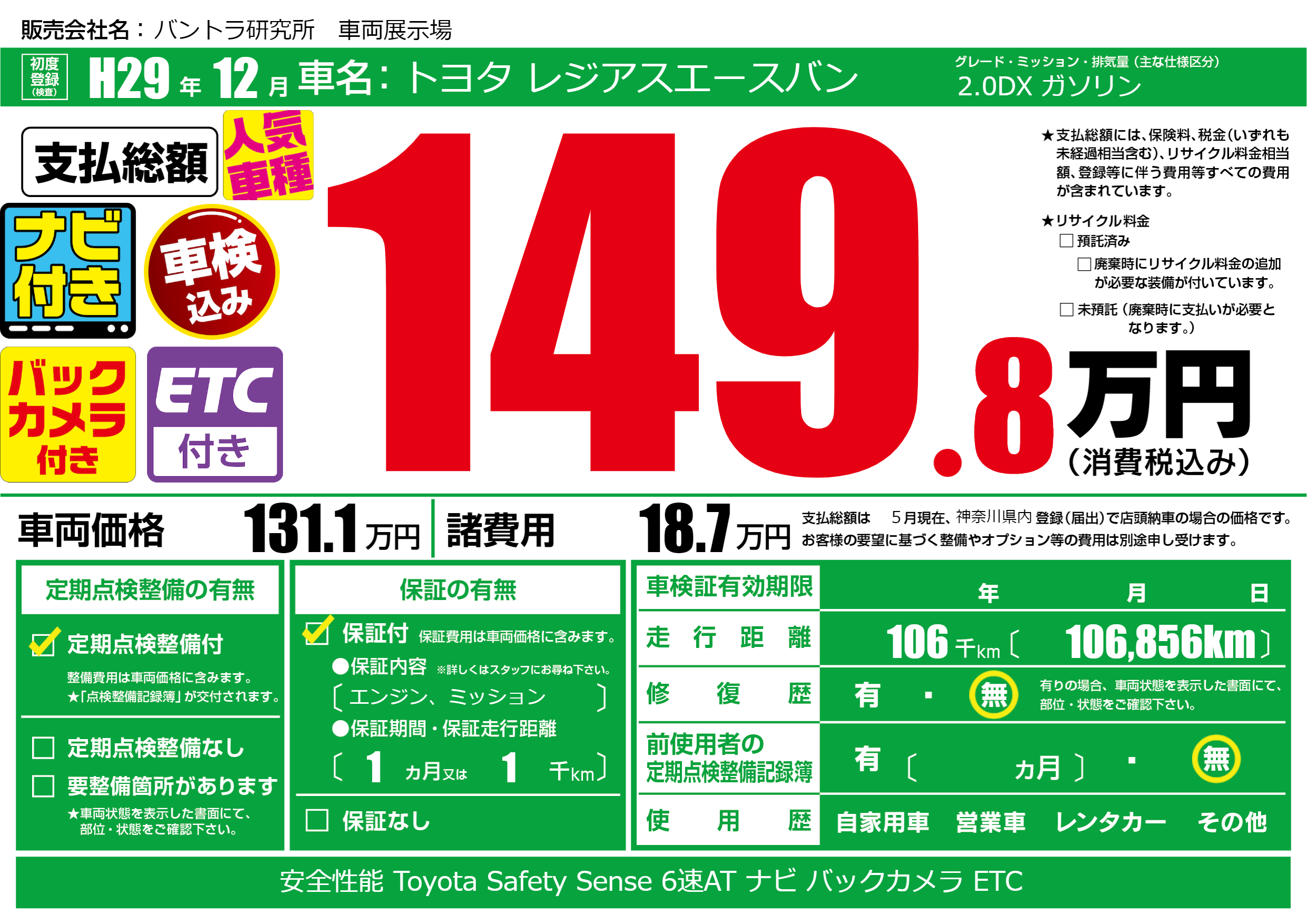 | 車名 | トヨタ レジアスエースバン | グレード ミッション 排気量 |