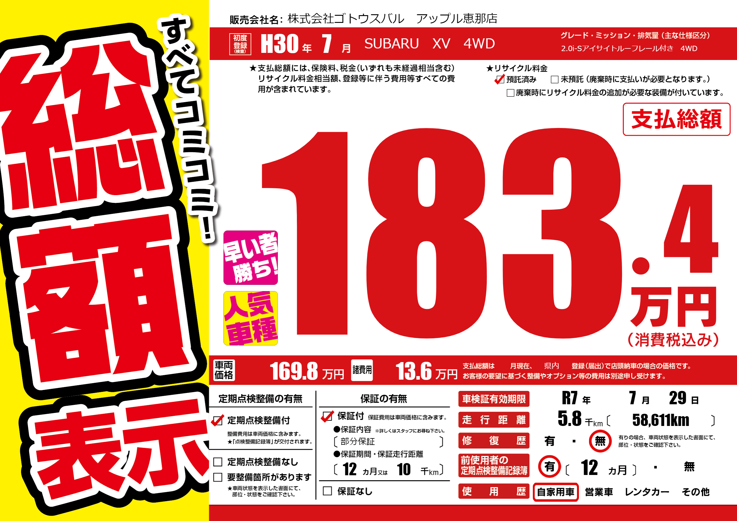 | 車名 | SUBARU XV 4WD | グレード ミッション 排気量 |