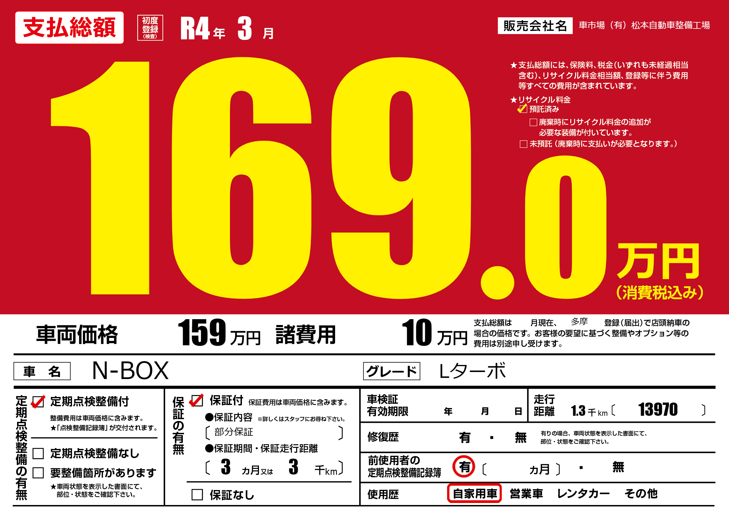 | 車名 | N-BOX | グレード ミッション 排気量 |