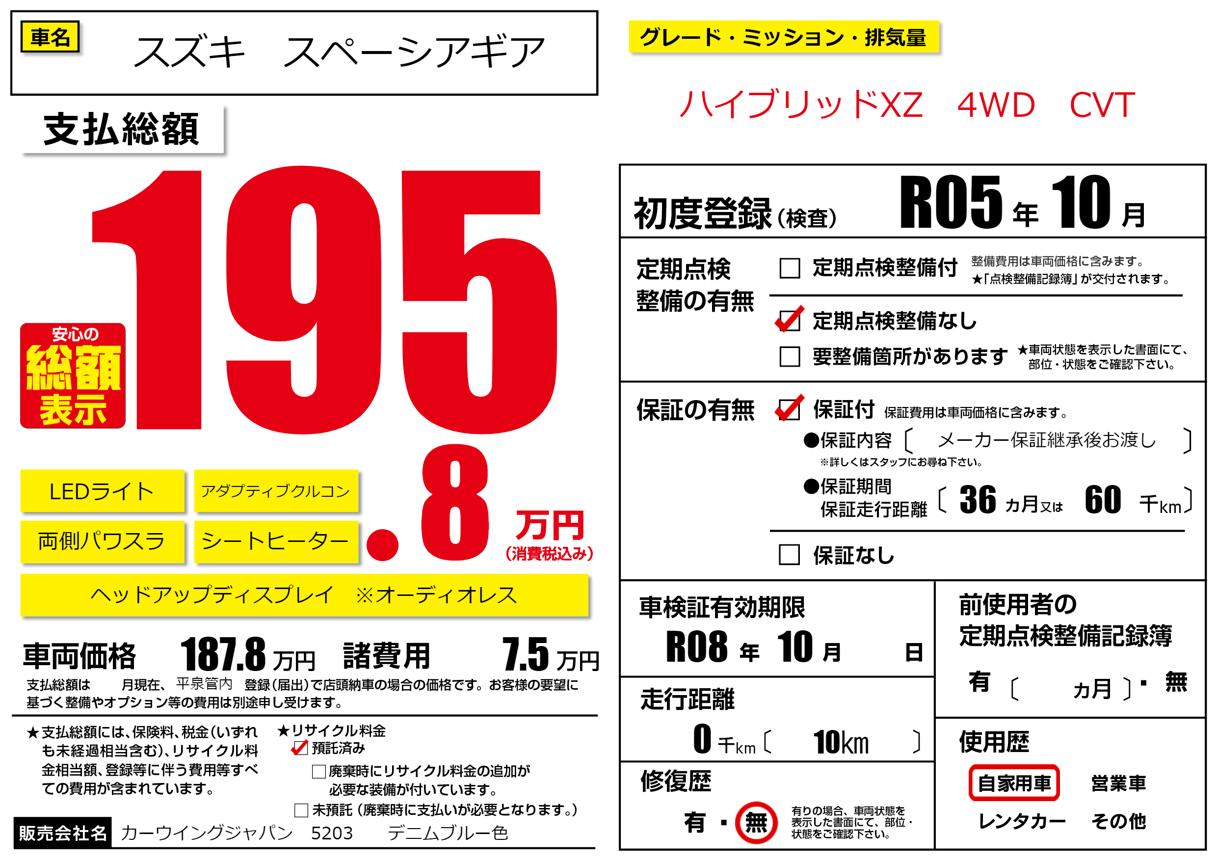 | 車名 | スズキ スペーシアギア | グレード ミッション 排気量 |