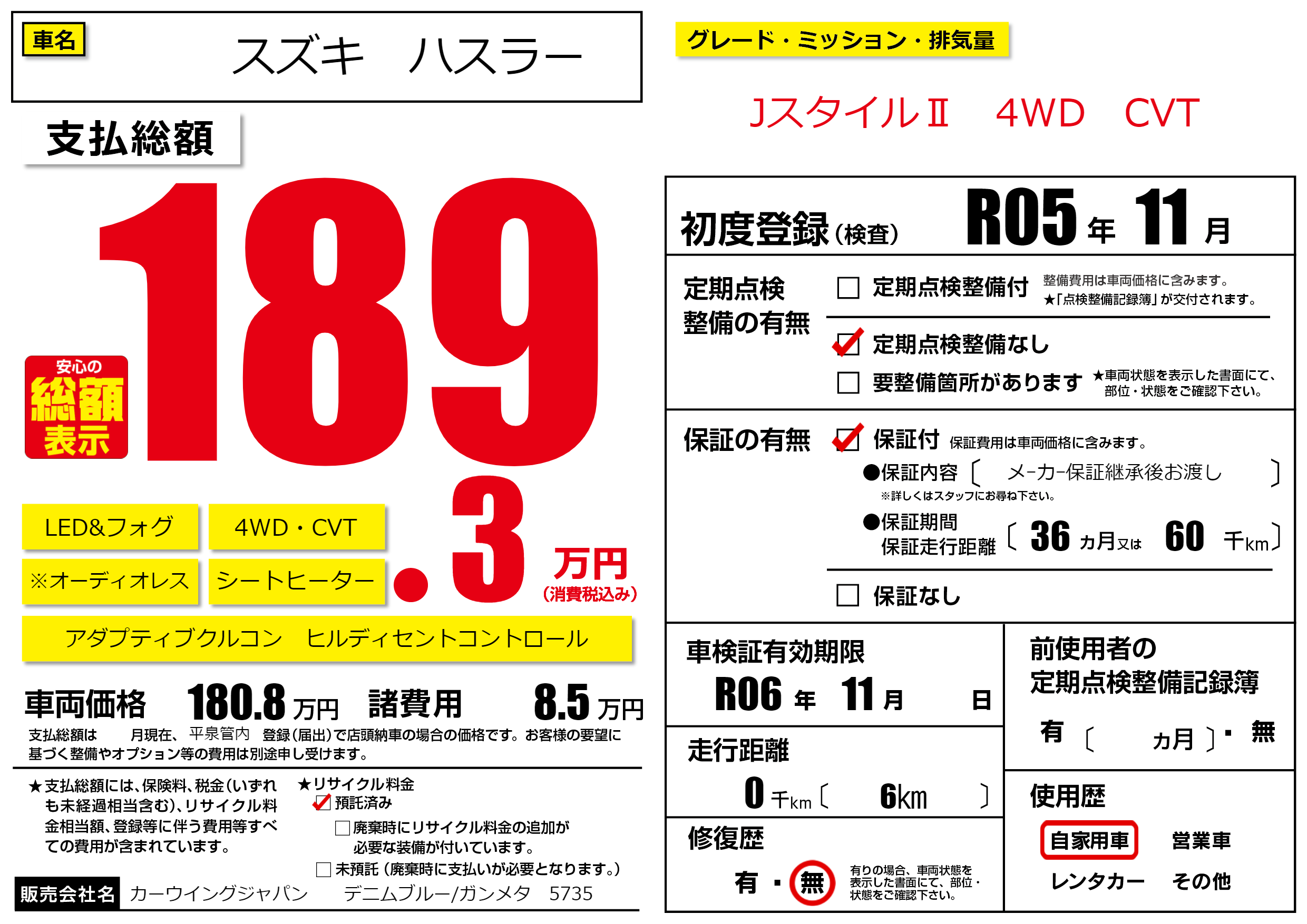 | 車名 | スズキ ハスラー | グレード ミッション 排気量 |