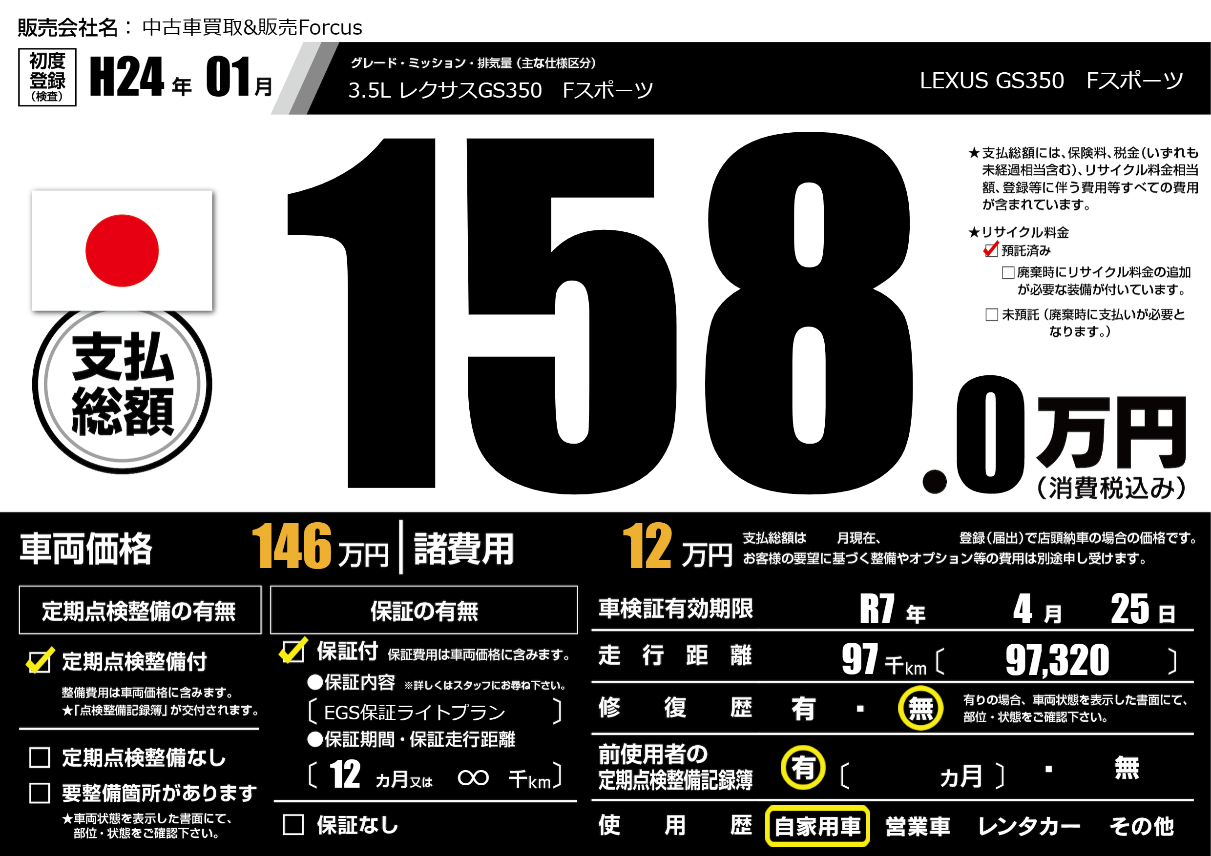 | 車名 | LEXUS GS350 Fスポーツ | グレード ミッション 排気量 |