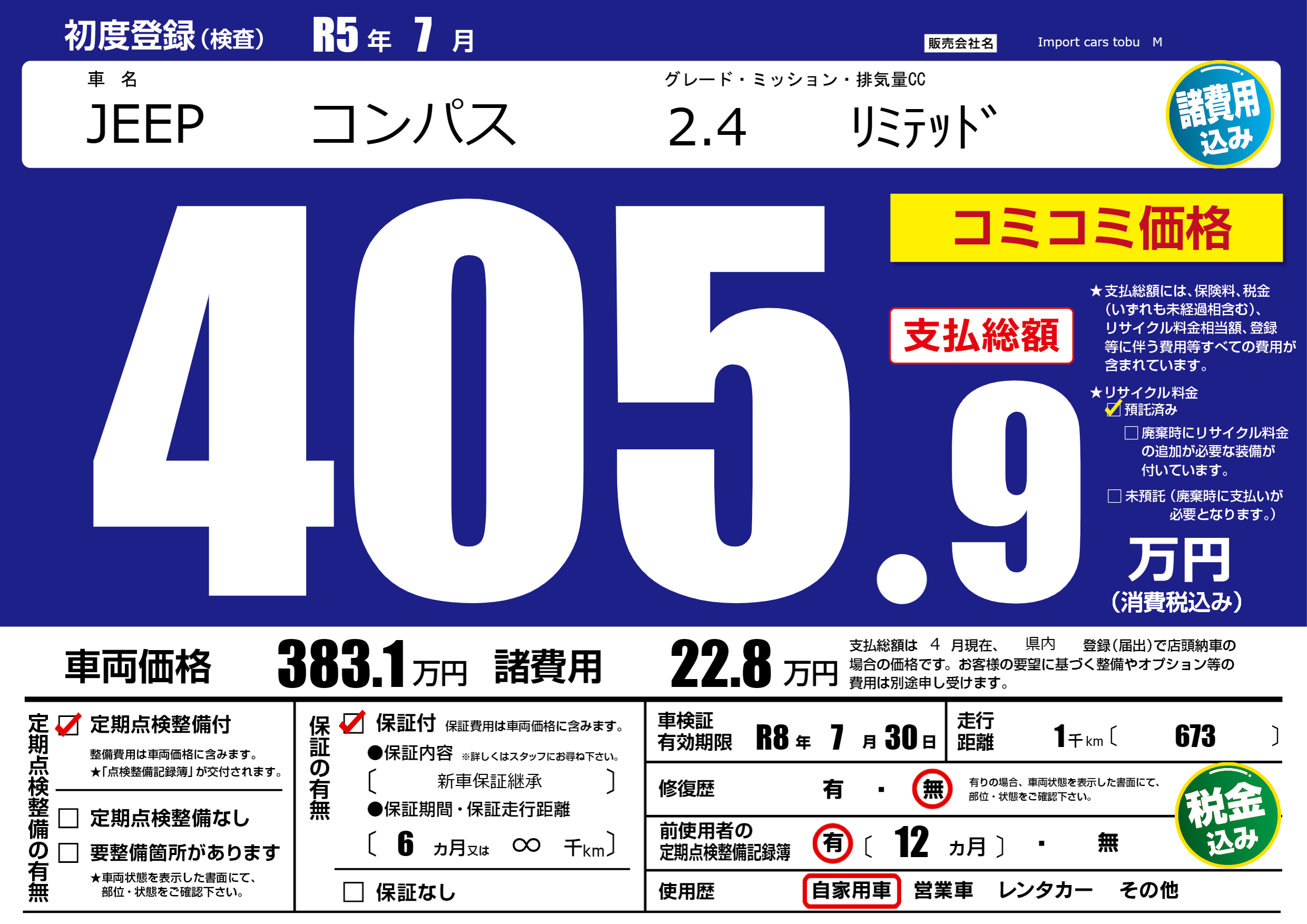 | 車名 | JEEP コンパス | グレード ミッション 排気量 |