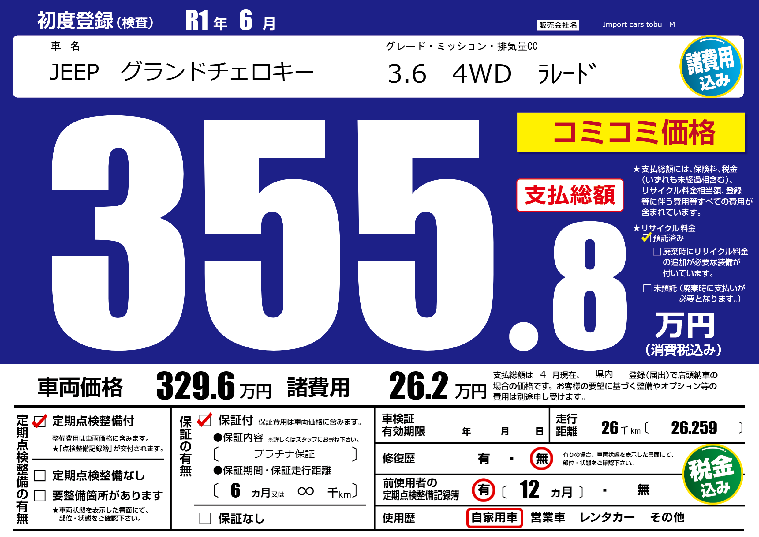 | 車名 | JEEP グランドチェロキー | グレード ミッション 排気量 |